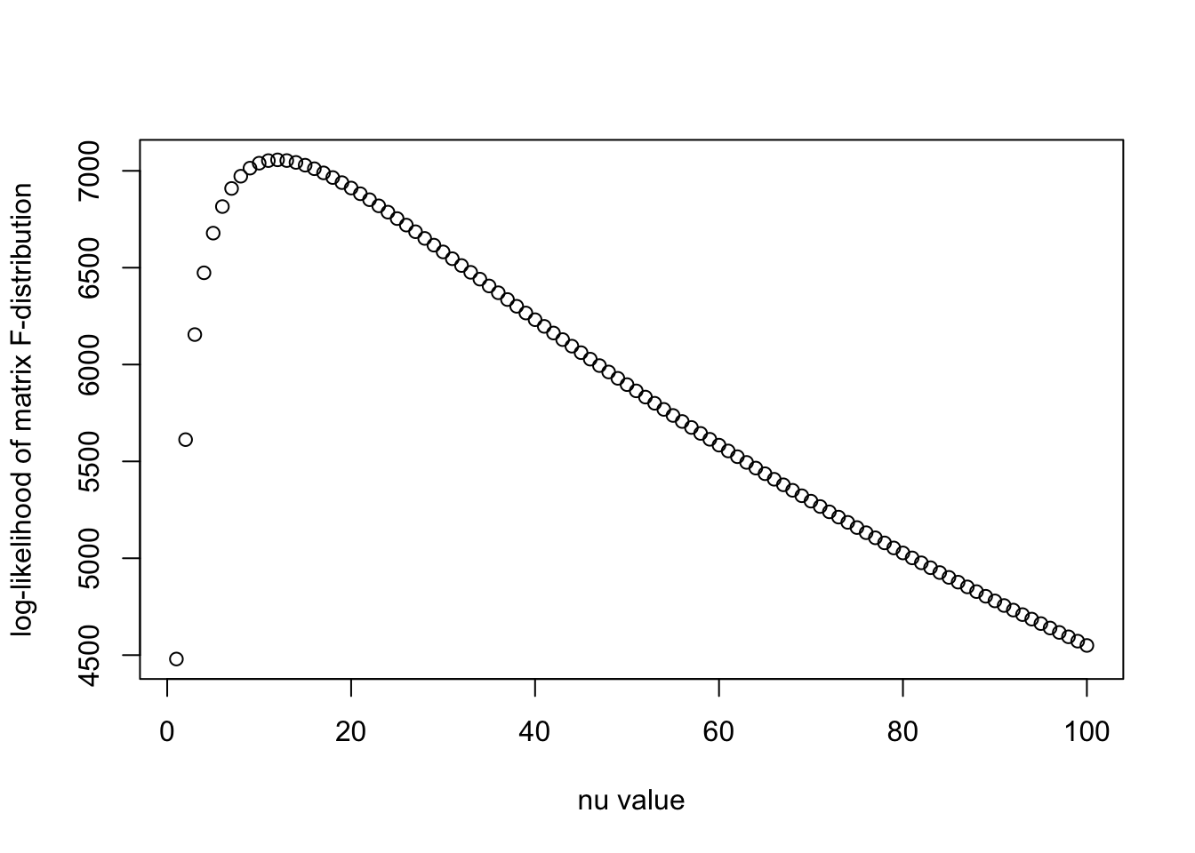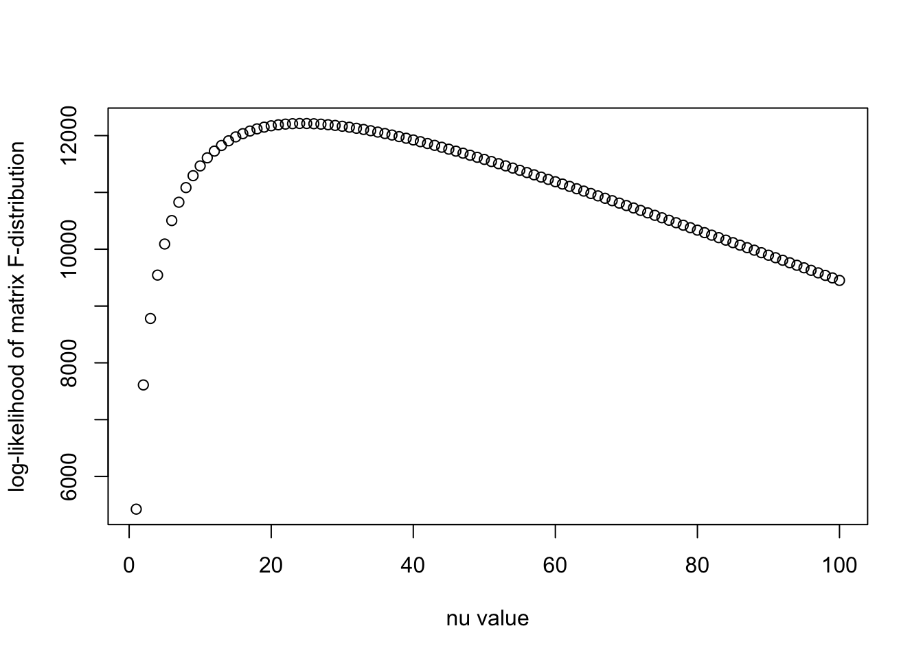 plot(nu_vec, llhs, xlab = "nu value", ylab = "log-likelihood of matrix F-distribution")