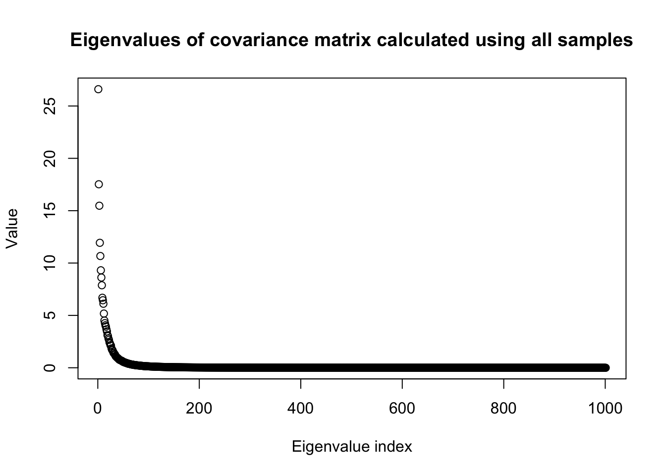 main = "Eigenvalues of covariance matrix calculated using all samples",