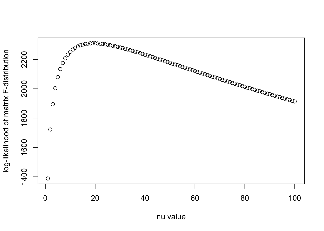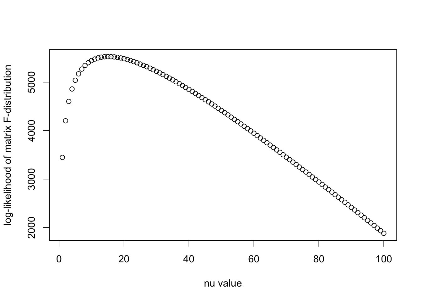 plot(nu_vec, llhs, xlab = "nu value", ylab = "log-likelihood of matrix F-distribution")