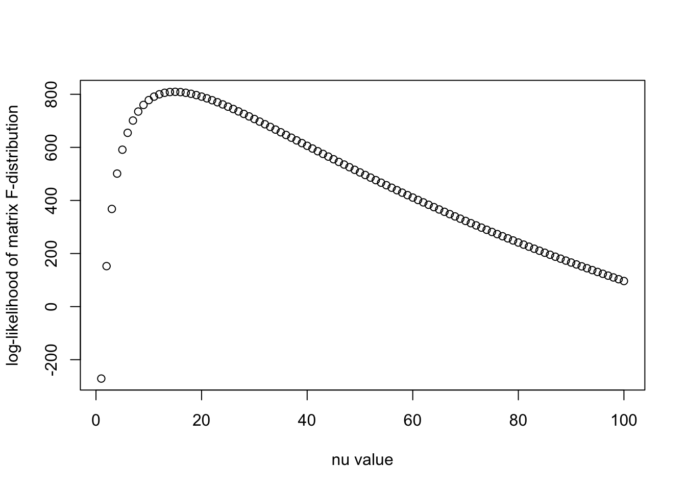 plot(nu_vec, llhs, xlab = "nu value", ylab = "log-likelihood of matrix F-distribution")