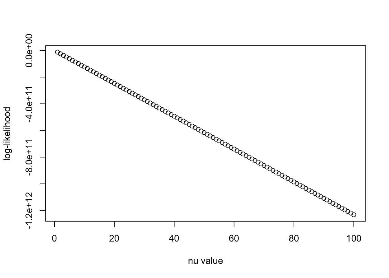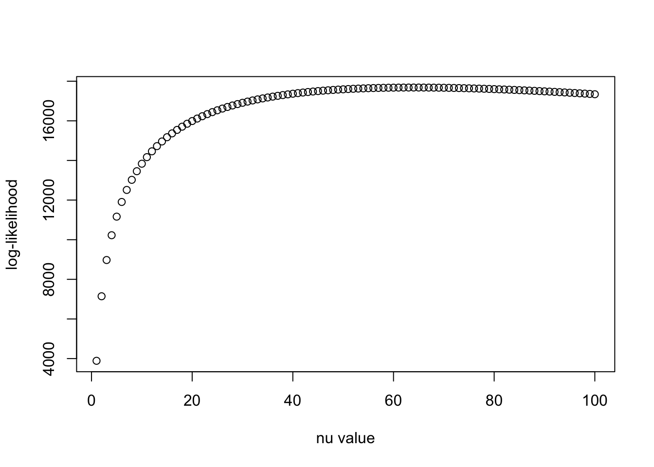 plot(nu_vec, llhs, xlab = "nu value", ylab = "log-likelihood")