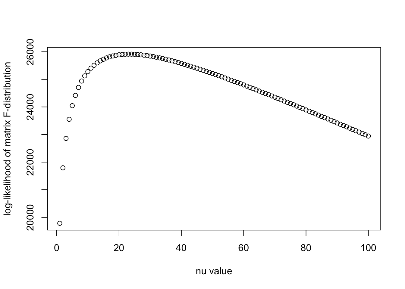 plot(nu_vec, llhs, xlab = "nu value", ylab = "log-likelihood of matrix F-distribution")