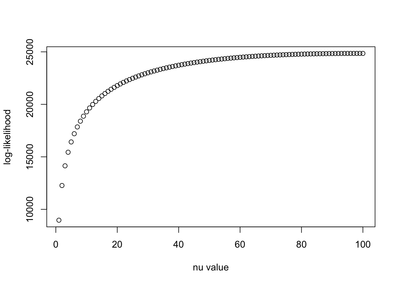 plot(nu_vec, llhs, xlab = "nu value", ylab = "log-likelihood")