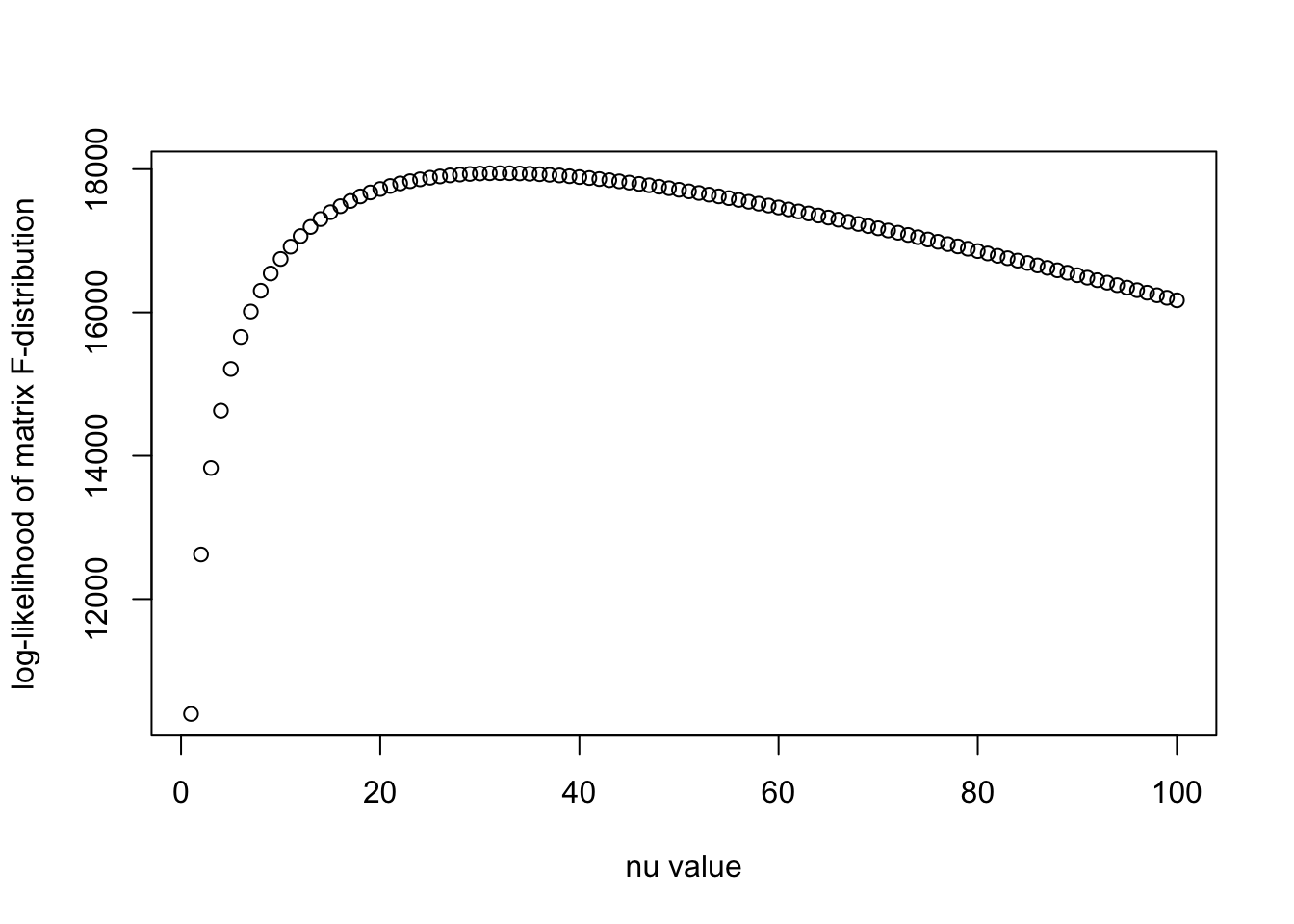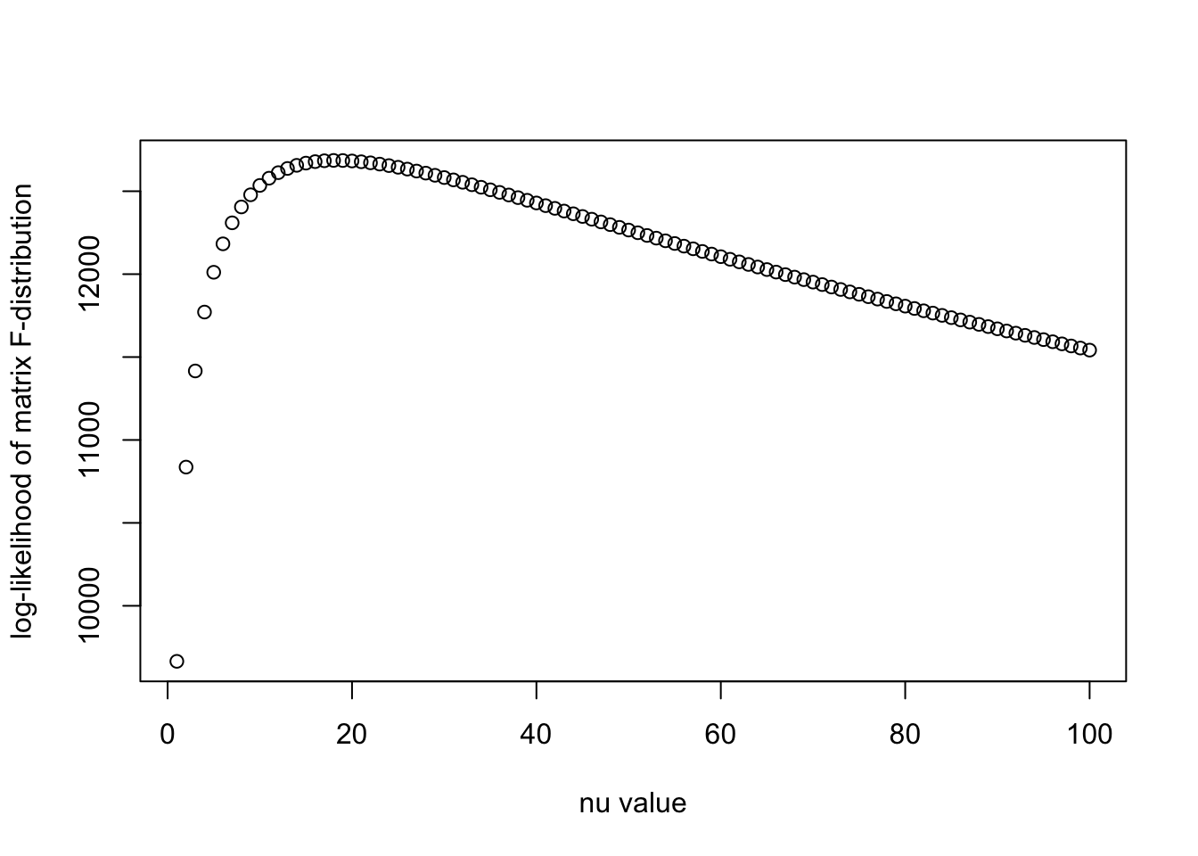 plot(nu_vec, llhs, xlab = "nu value", ylab = "log-likelihood of matrix F-distribution")