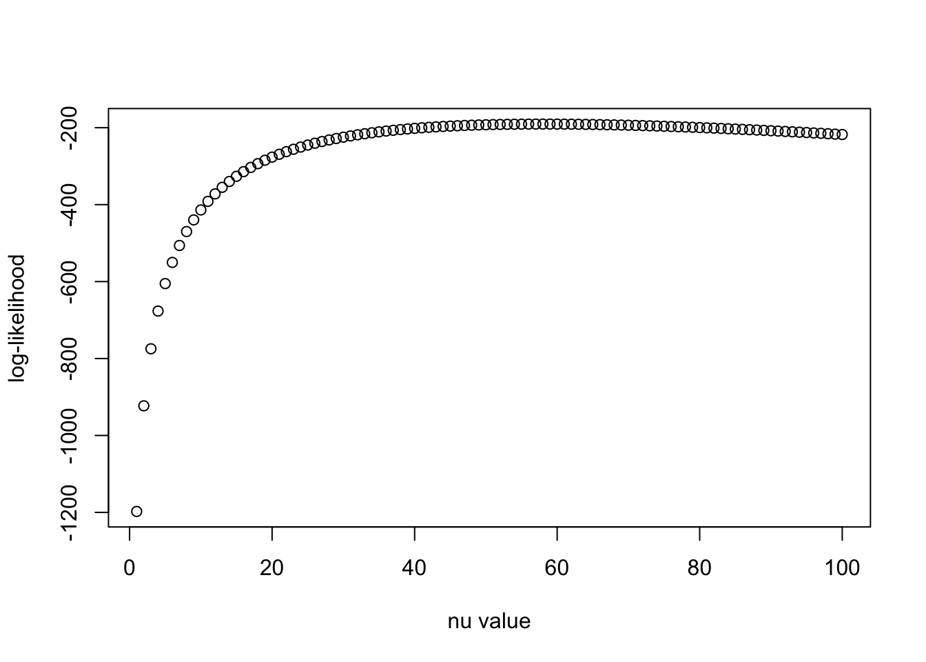 plot(nu_vec, llhs, xlab = "nu value", ylab = "log-likelihood")