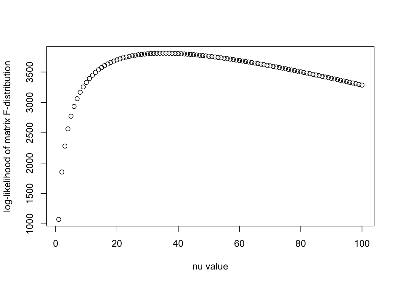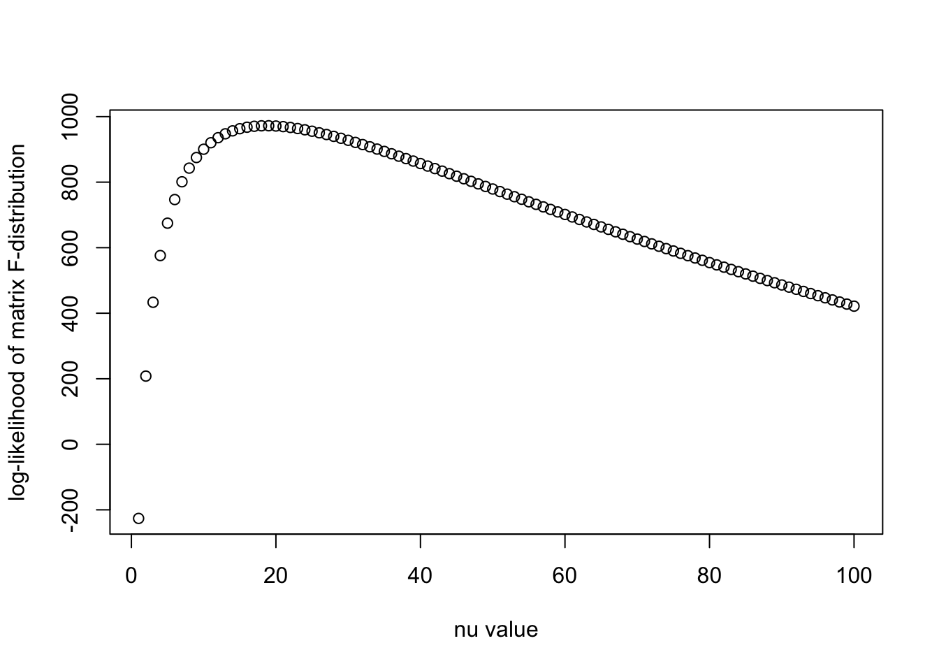 plot(nu_vec, llhs, xlab = "nu value", ylab = "log-likelihood of matrix F-distribution")