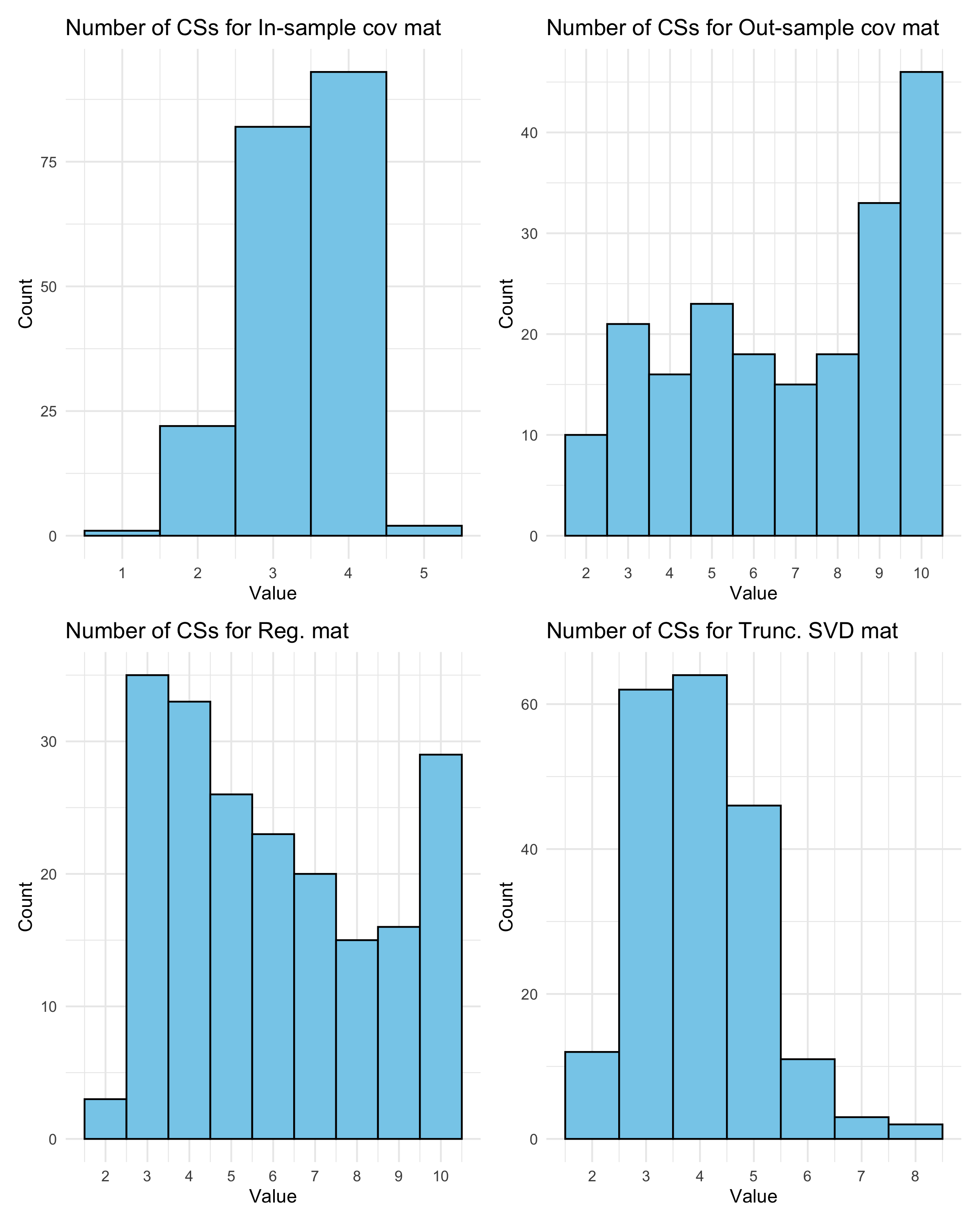 cov_type = c('In-sample cov mat', 'Out-sample cov mat', 'Reg. mat', 'Trunc. SVD mat')