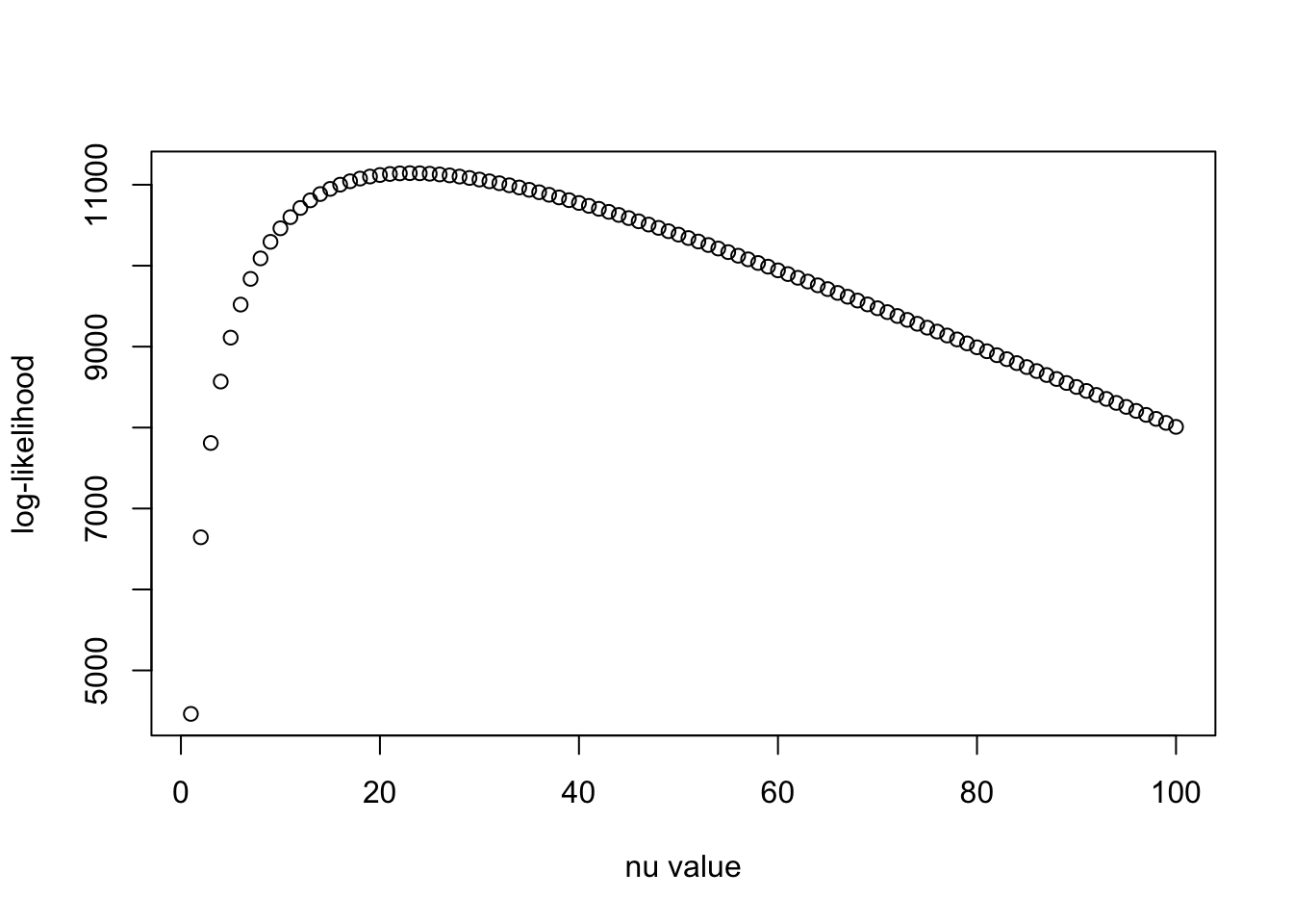 plot(nu_vec, llhs, xlab = "nu value", ylab = "log-likelihood")