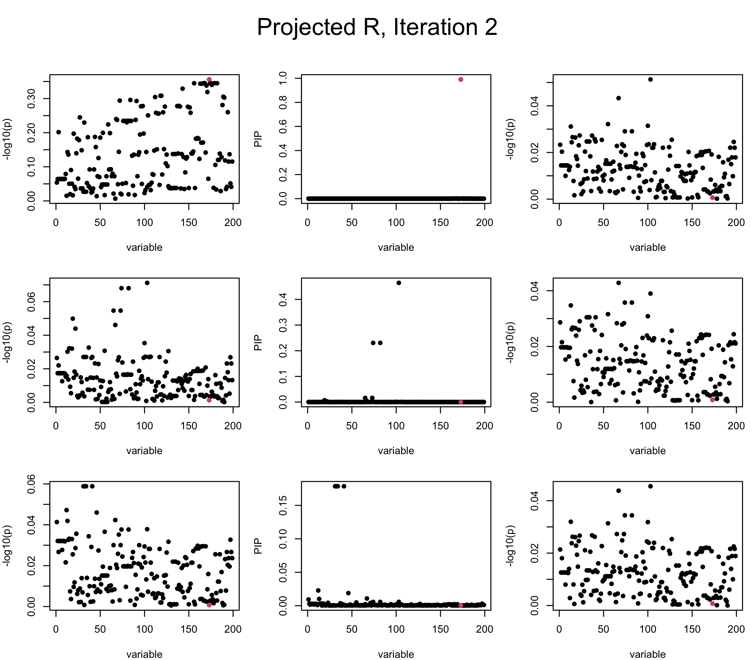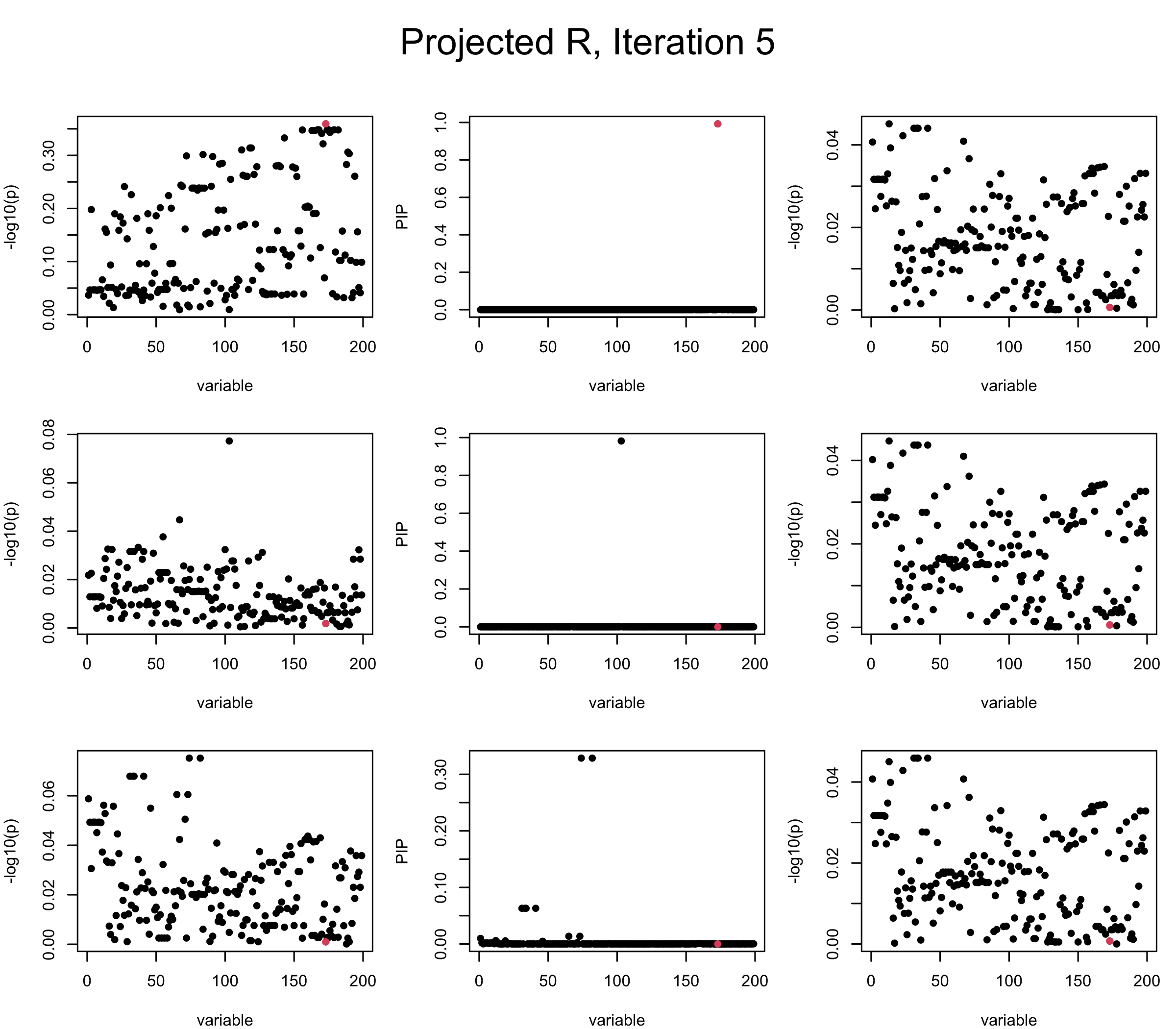Note that the title of the figure corresponds to SuSiE’s outer loop. Each figure has 3 rows correspond to the inner loop from 1 to \(L = 3\). The algorithm often converges after around 5 iteration (outer loop) so we only look at the first 5.