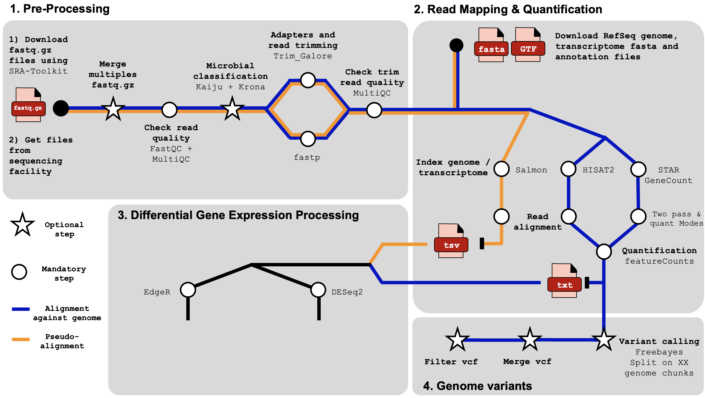 We use a Snakemake pipeline for each species. Therefore, it is essential to verify that each required software is installed and accessible. This can be done through various methods: 1) locally (e.g., cloned from GitHub or installed with admin access), 2) as a HPRC cluster module on the Grace cluster at Texas A&M University or 3) via a conda environment.