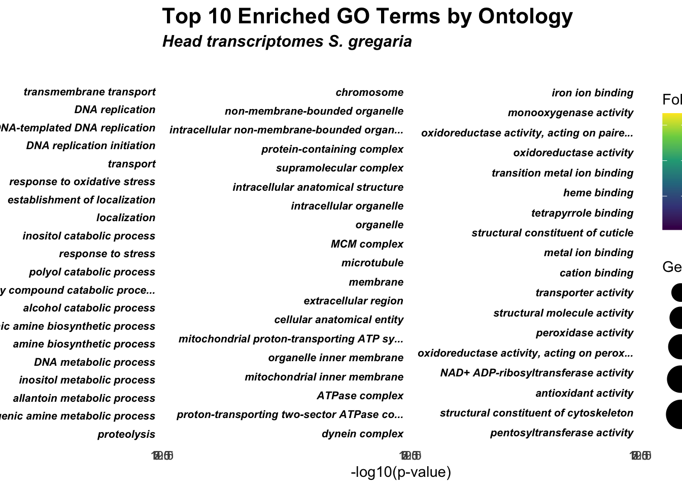 Once we have shortlisted some genes of interest—whether they are obtained from top differentially expressed genes (DEGs), weighted gene co-expression network analysis (WGCNA) modules, or other comparative genomics analyses (e.g., signatures of selection, gene family expansion)—we want to determine if certain functions are enriched in our subset. For example, we hypothesize that although locusts have evolved similar traits, they may have diverged in their strategies to respond to the environment. Therefore, we expect to see DEGs involved in divergent biological processes, molecular function, and cellular components between S. gregaria, S. piceifrons and S. cancellata.