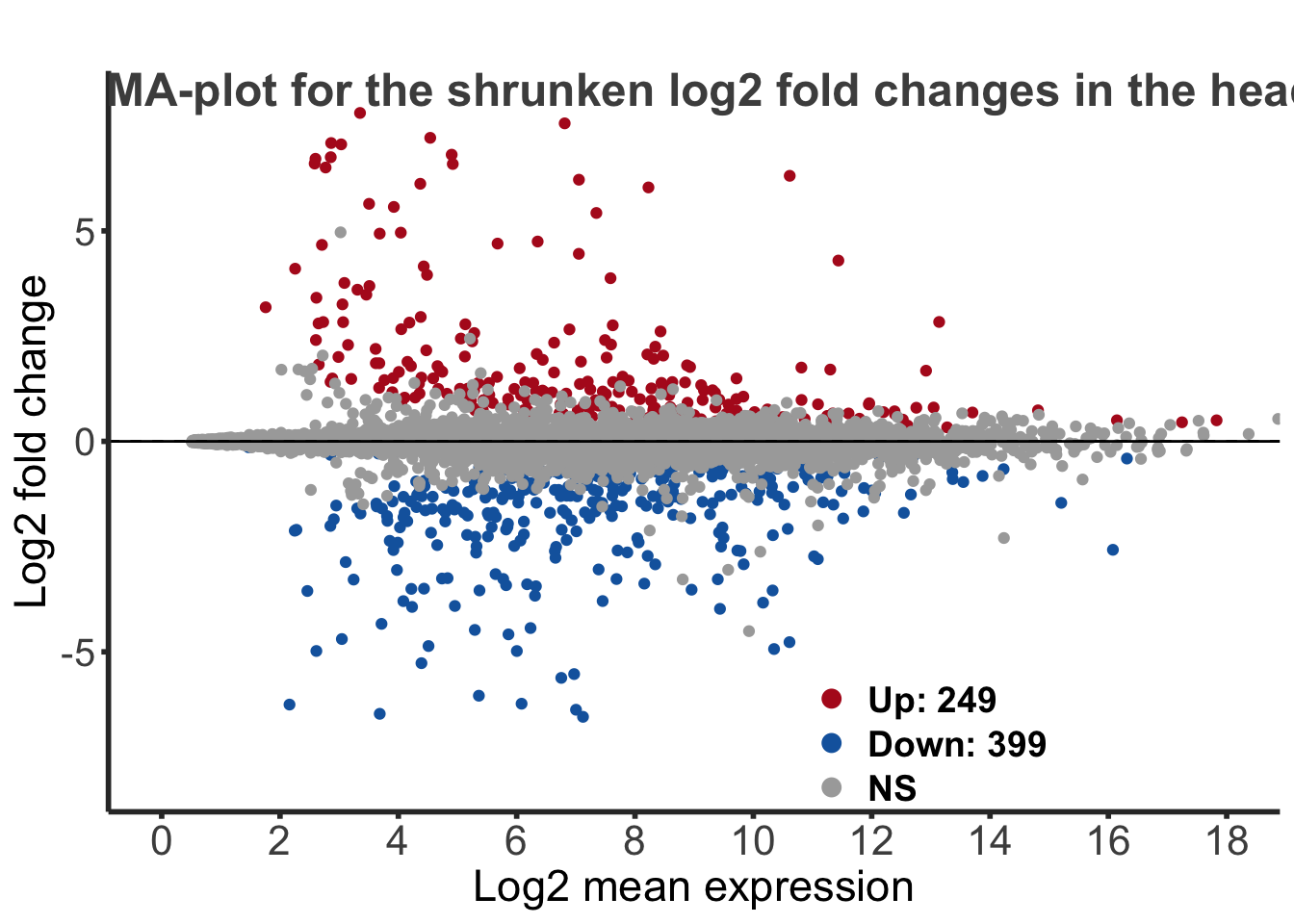 colour = "gray30", face = "bold", hjust = 0.06, vjust = -5)) + labs(title = "MA-plot for the shrunken log2 fold changes in the head")