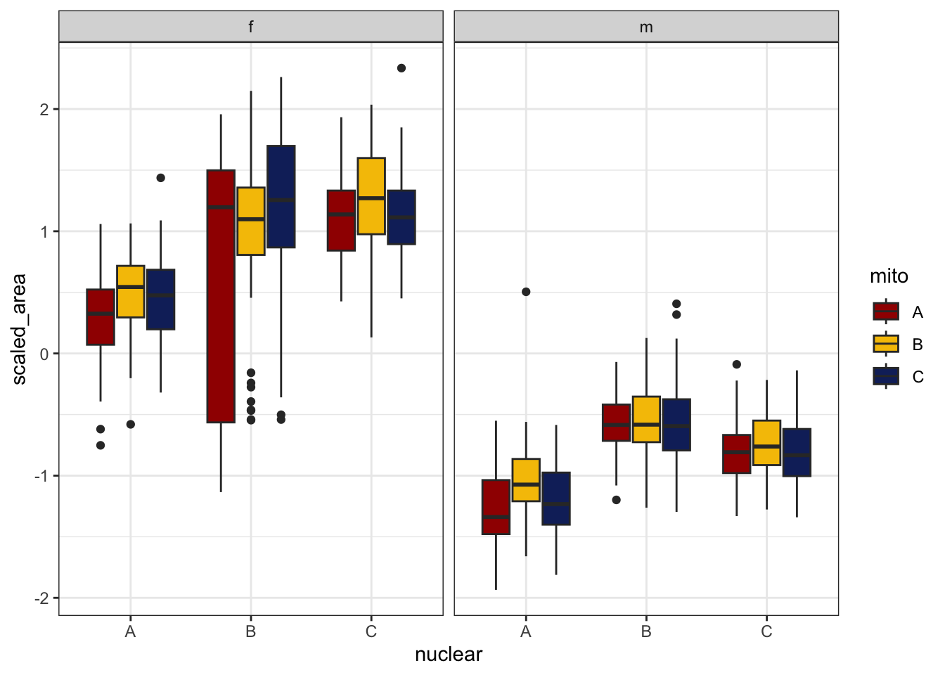 snp_full <- lmerTest::lmer(scaled_area ~ mito_snp * nuclear * sex + (sex|LINE) + (1|fam),