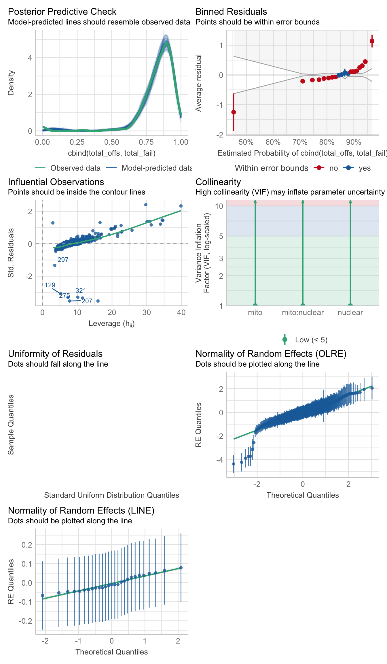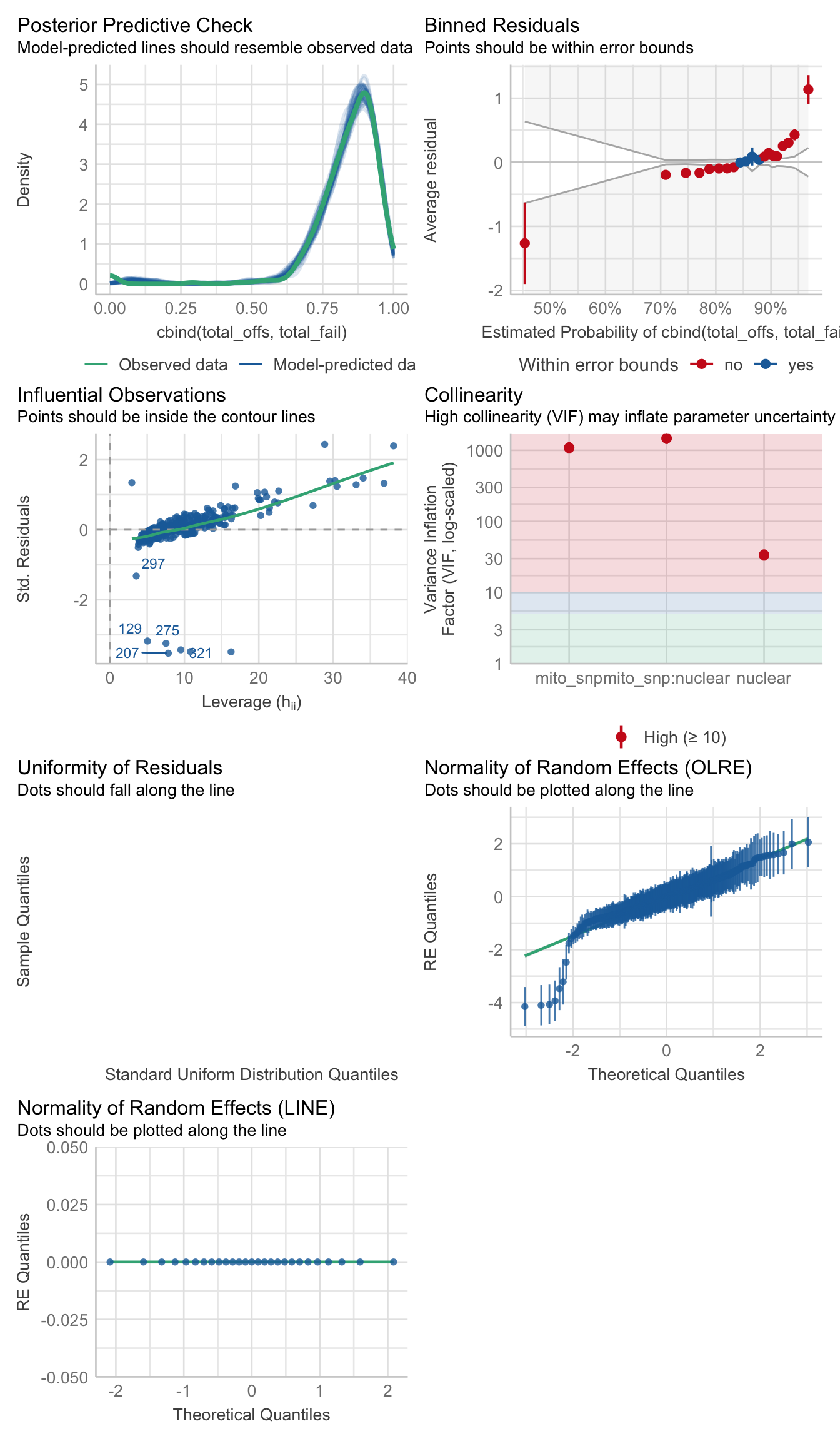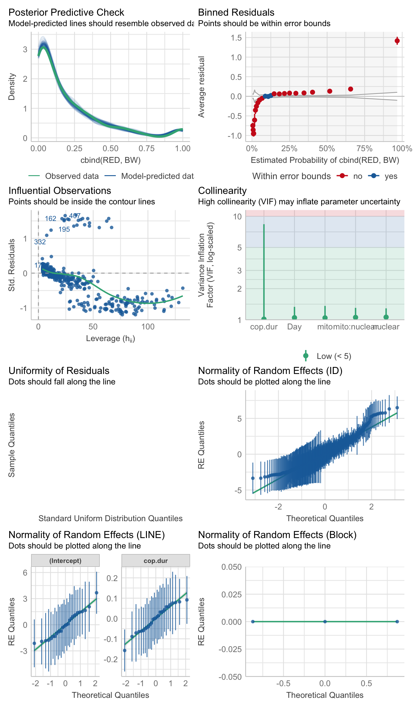 p2.mod1 <- glmer(cbind(RED, BW) ~ mito * nuclear + Day + cop.dur + (1 + cop.dur|LINE) + (1|ID) + (1|Block),