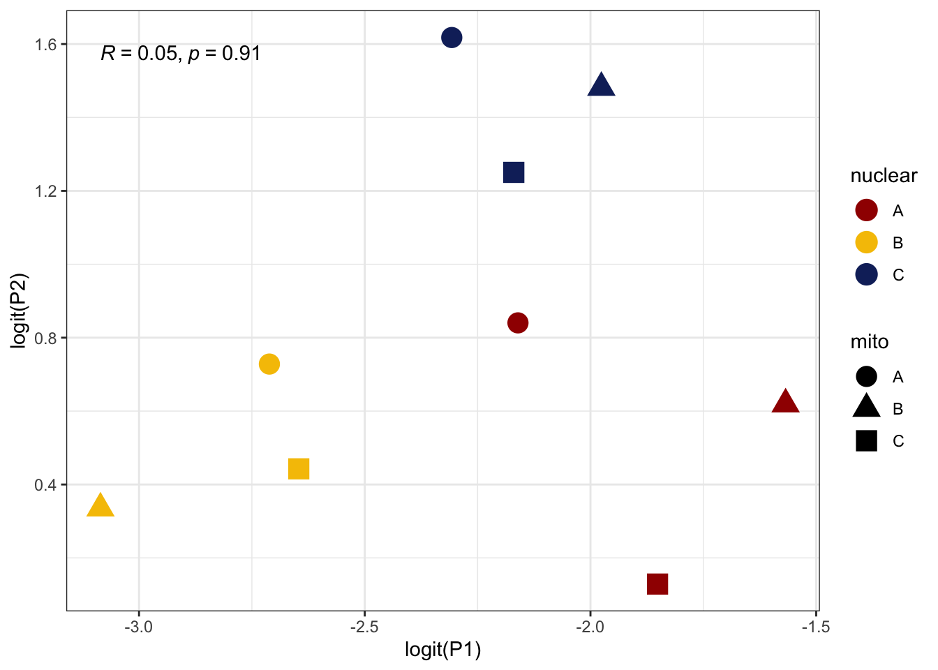 ggplot(aes(x = nuclear, y = P2, colour = mito)) +