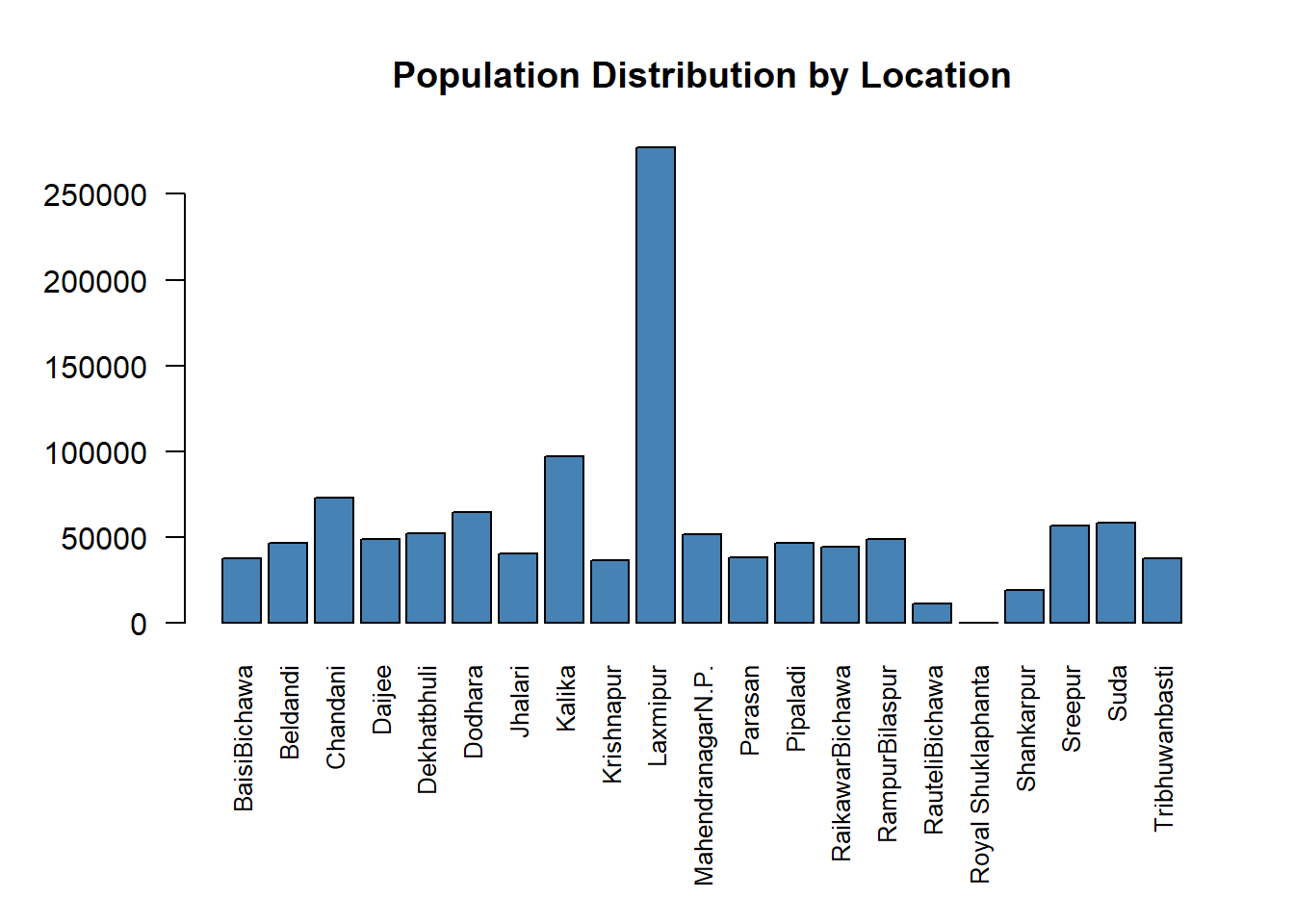 From the barplot above, we can see that Laxmipur is the most densely populated region, while Royal Shuklaphanta is the least populated region in Kanchanpur district.