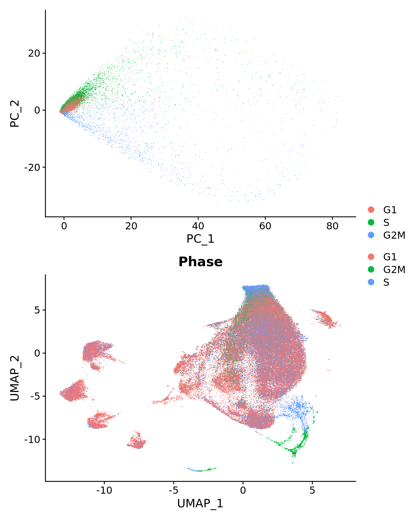 seu <- CellCycleScoring(seu, s.features = s.genes, g2m.features = g2m.genes,