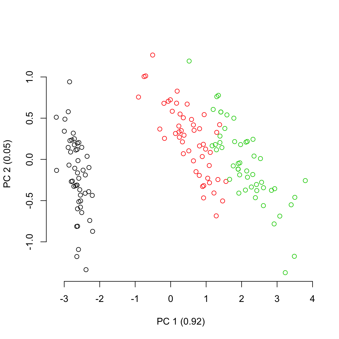 plot(petal_space[, 1], petal_space[, 2], col = species,