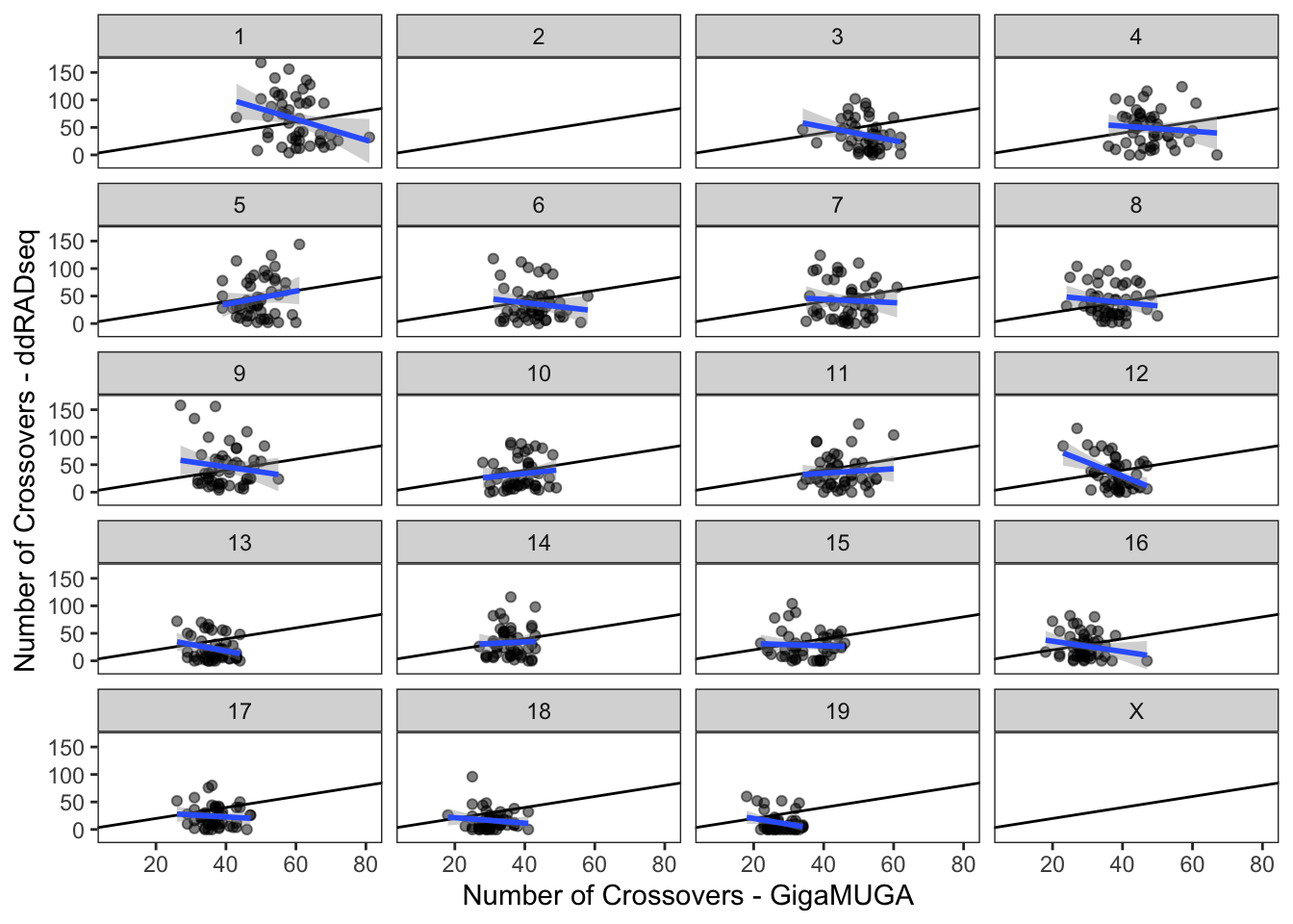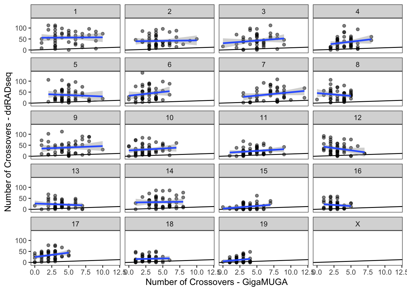 As expected based on previous analyses, there is no correlation between crossover events in the same samples using different genotyping methods. We hypothesize this concordance will improve with better sequencing coverage and, therefore, greater genotyping and haplotype inference accuracy by STITCH.
