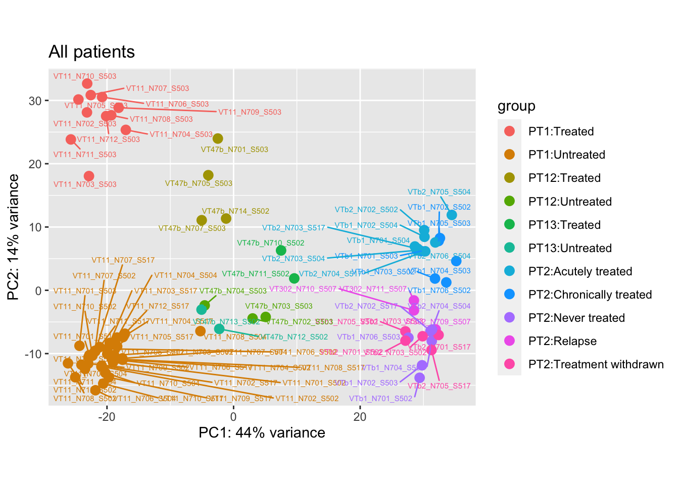 # knitr::opts_chunk$set(cache = T, autodep = T)This is based on merged_gene_counts.bulk.txt.gz and includes all four patients (PT1, PT2, PT12 and PT13). PT12 and PT13 were added at a later date and the data were re-processed all together from scratch with the NextFlow pipeline described above.