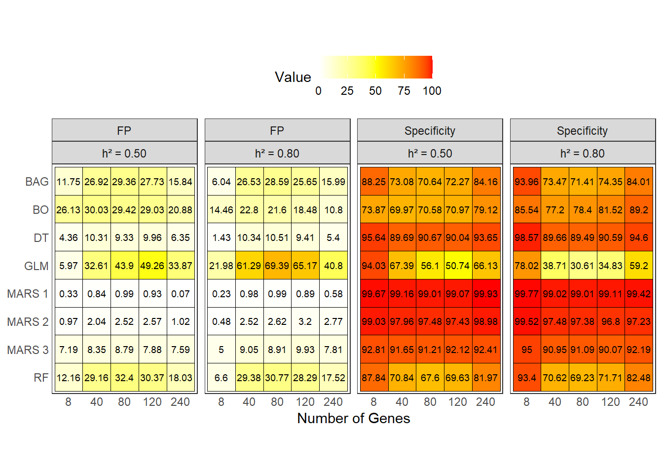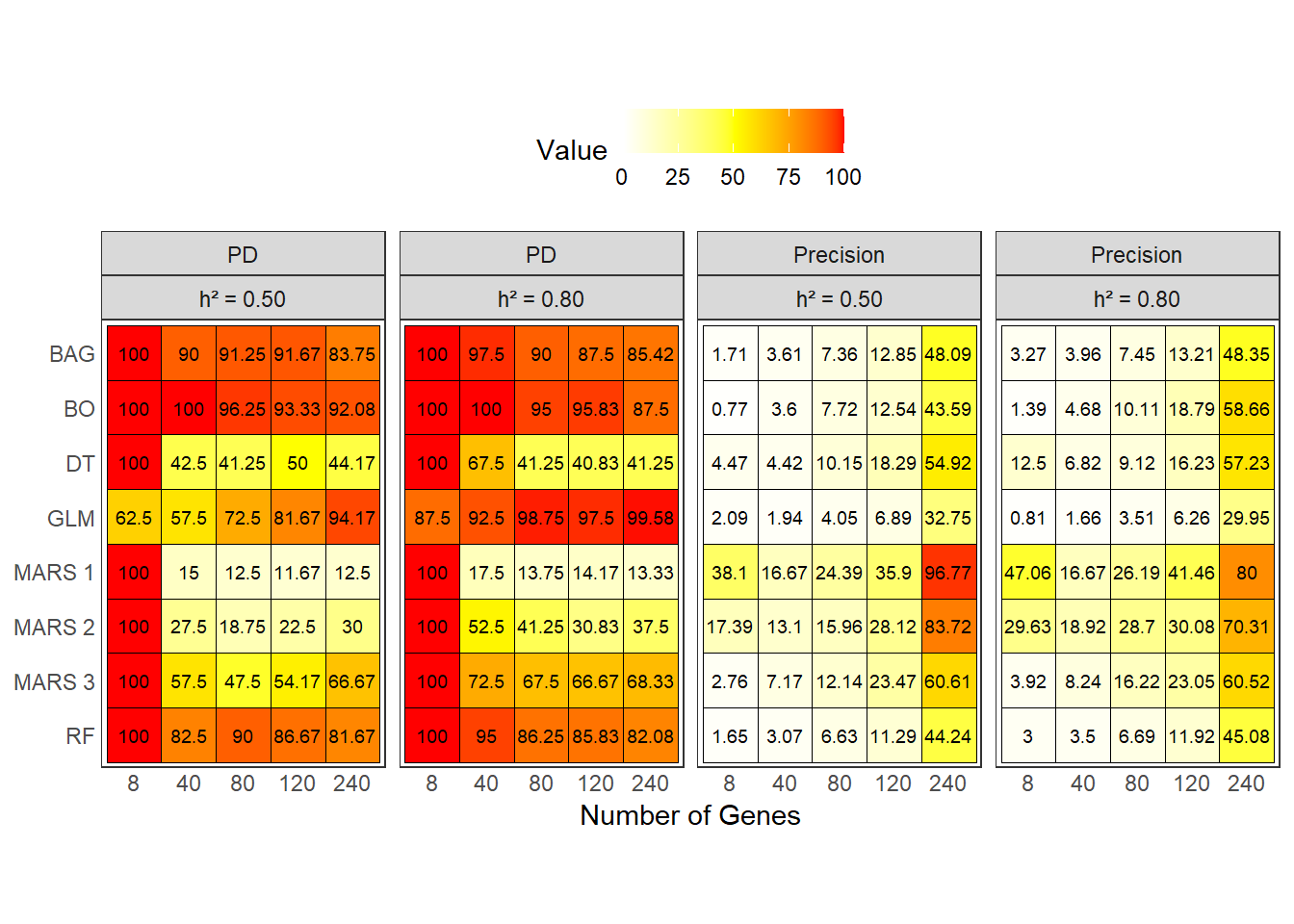De forma geral, embora redes neurais e G BLUP sejam sensíveis ao captar zonas ligadas, sua baixa especificidade compromete a aplicabilidade prática. Dentre as demais metodologias, os protocolos MARS se destacam pelo equilíbrio entre detecção e precisão, especialmente em cenários de alta herdabilidade e múltiplos QTLs.