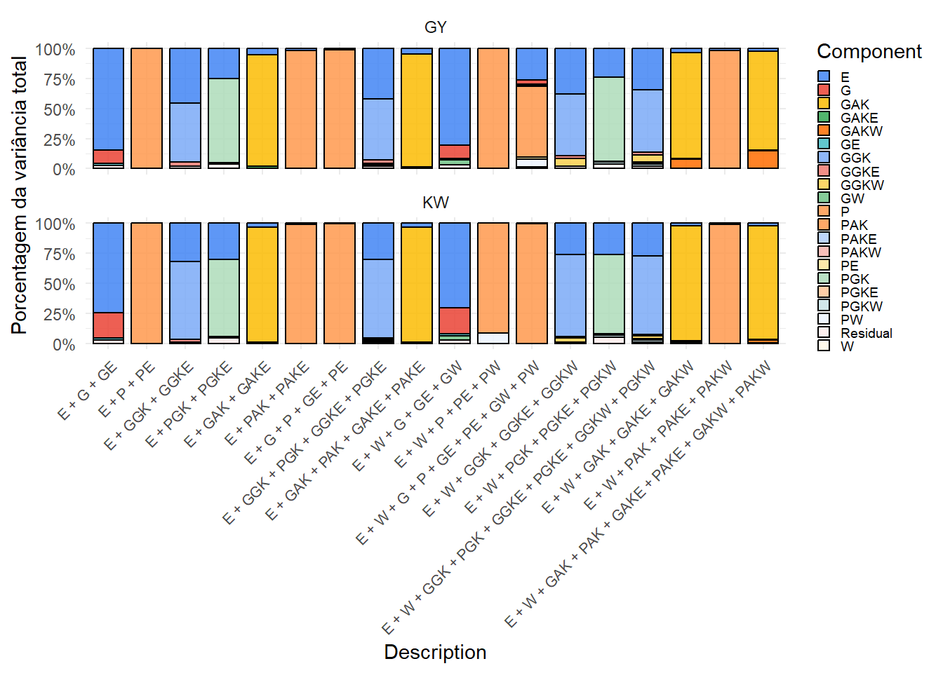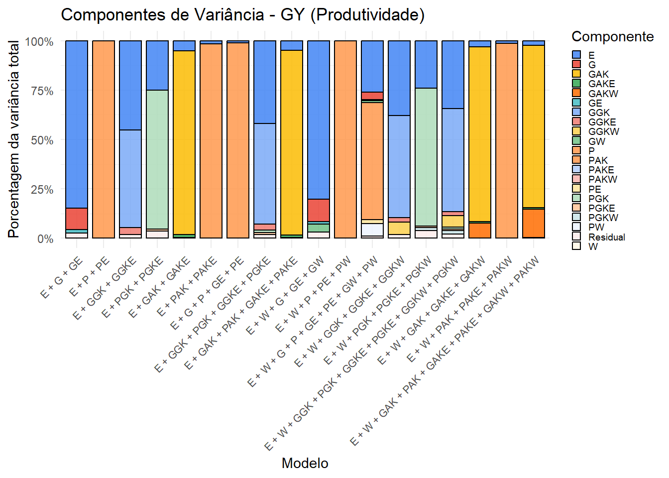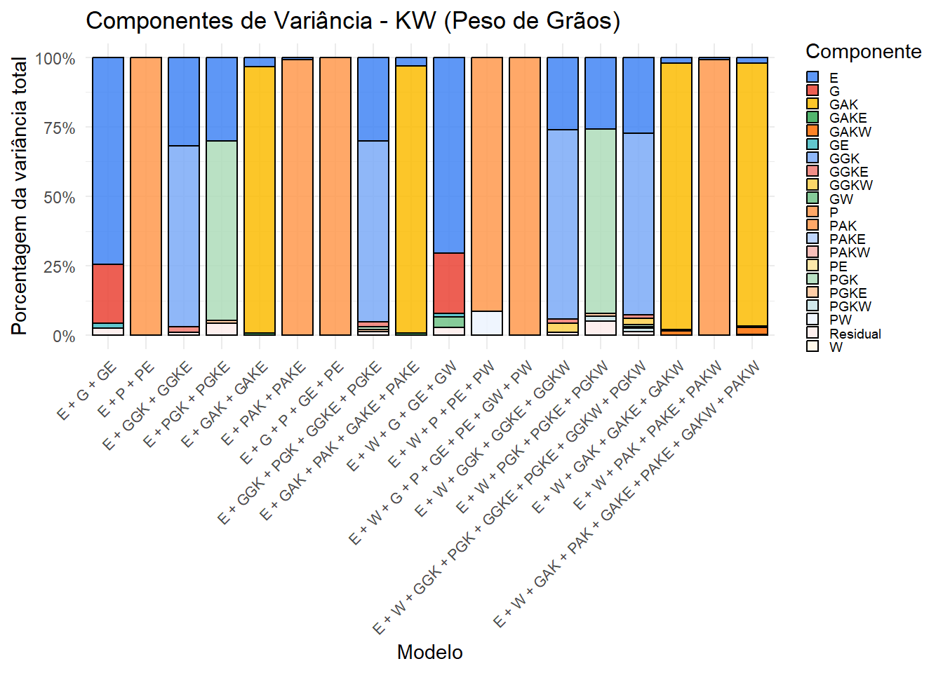 Os gráficos mostram a contribuição relativa de cada componente de variância nos diferentes modelos. A inclusão do kernel climático (W) e suas interações altera a partição, revelando a influência do ambiente na expressão fenotípica. Esses resultados complementam as análises de validação cruzada.
