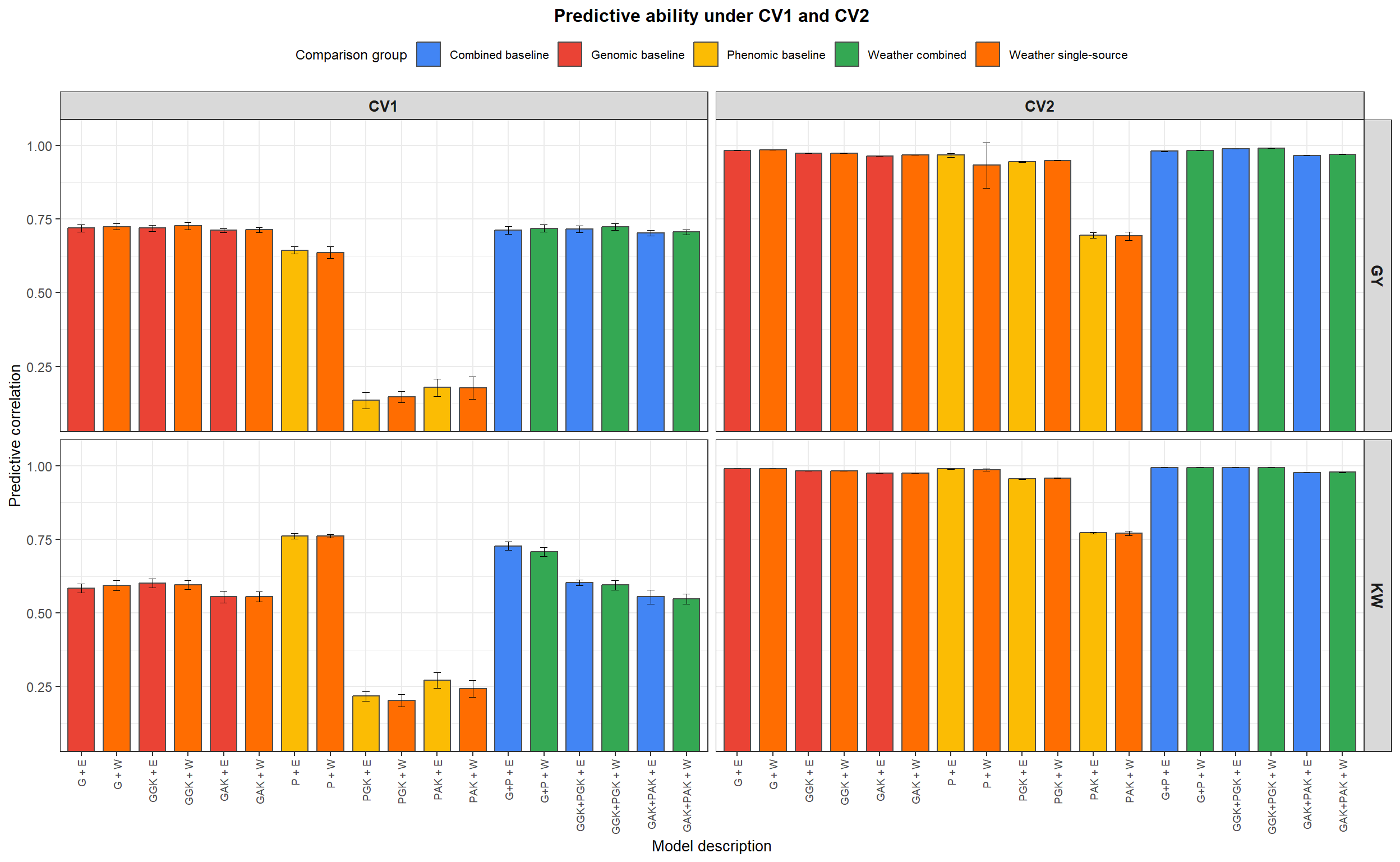The second figure summarizes predictive ability under CV0 and CV00, keeping the held-out environments explicit in the layout so that environmental differences remain visible.