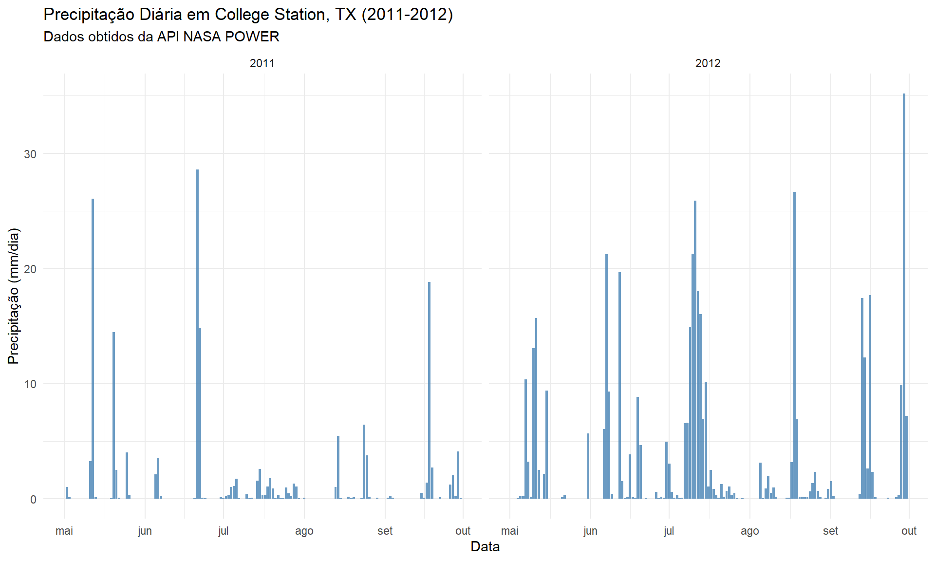 Este tutorial detalha o processo de obtenção e processamento de dados climáticos diários para os experimentos de milho no Texas (College Station, TX) realizados em 2011 e 2012.