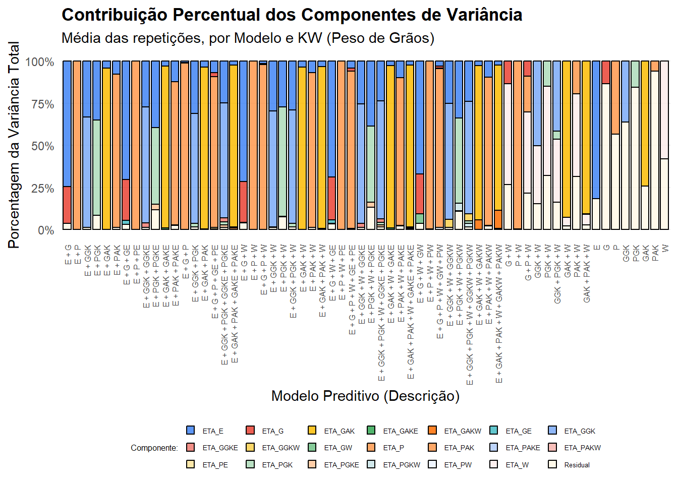 Este bloco é idêntico ao anterior, mas filtra os dados para o trait KW (Kernel Weight, ou Peso de Grãos). Ele gera e salva um gráfico separado, permitindo uma análise independente da partição da variância para esta característica.