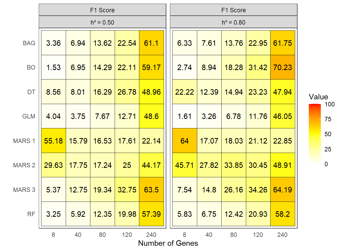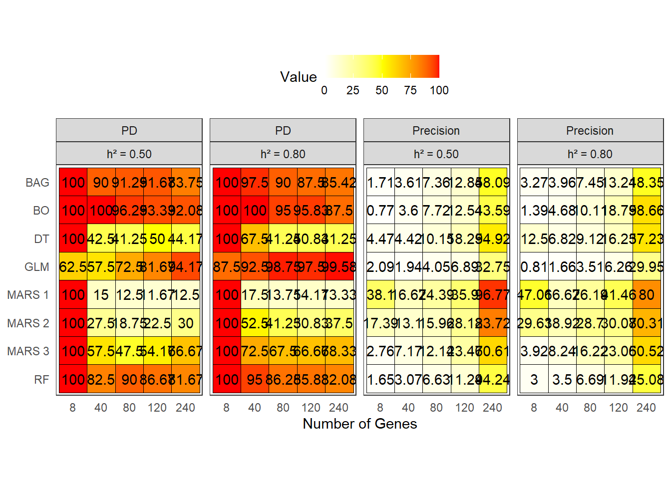 De forma geral, embora redes neurais e G BLUP sejam sensíveis ao captar zonas ligadas, sua baixa especificidade compromete a aplicabilidade prática. Dentre as demais metodologias, os protocolos MARS se destacam pelo equilíbrio entre detecção e precisão, especialmente em cenários de alta herdabilidade e múltiplos QTLs.