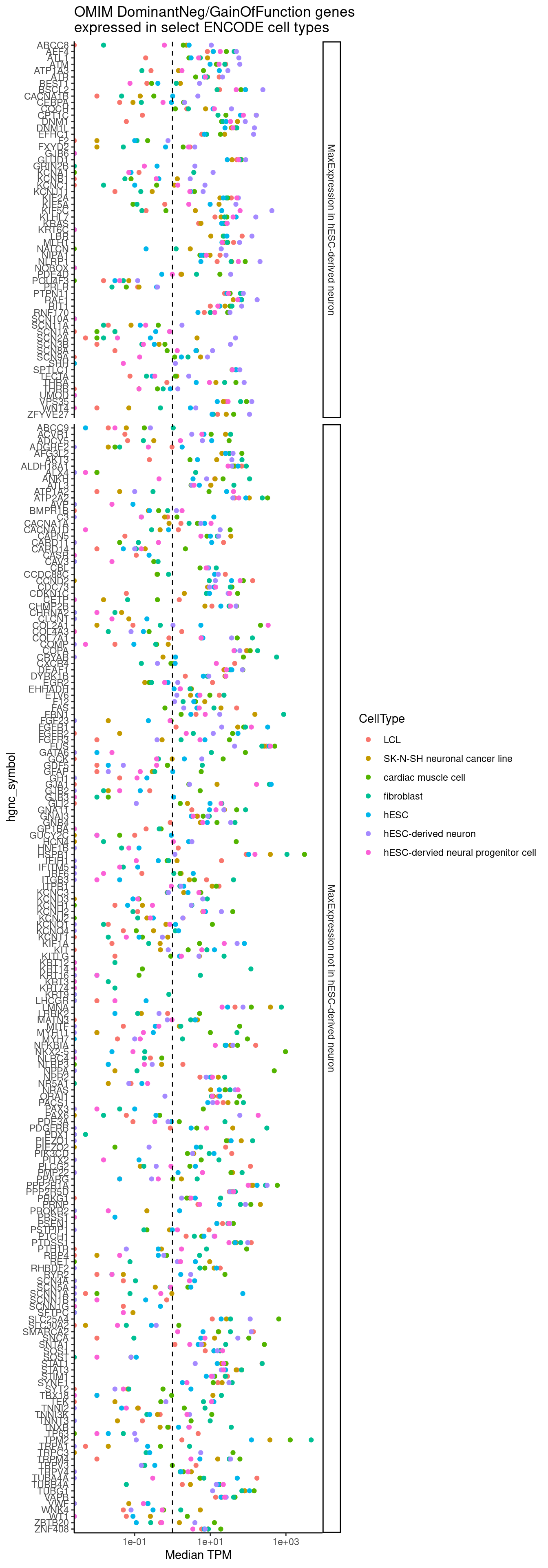 labs(title="OMIM DominantNeg/GainOfFunction genes\nexpressed in select ENCODE cell types", x="Median TPM")