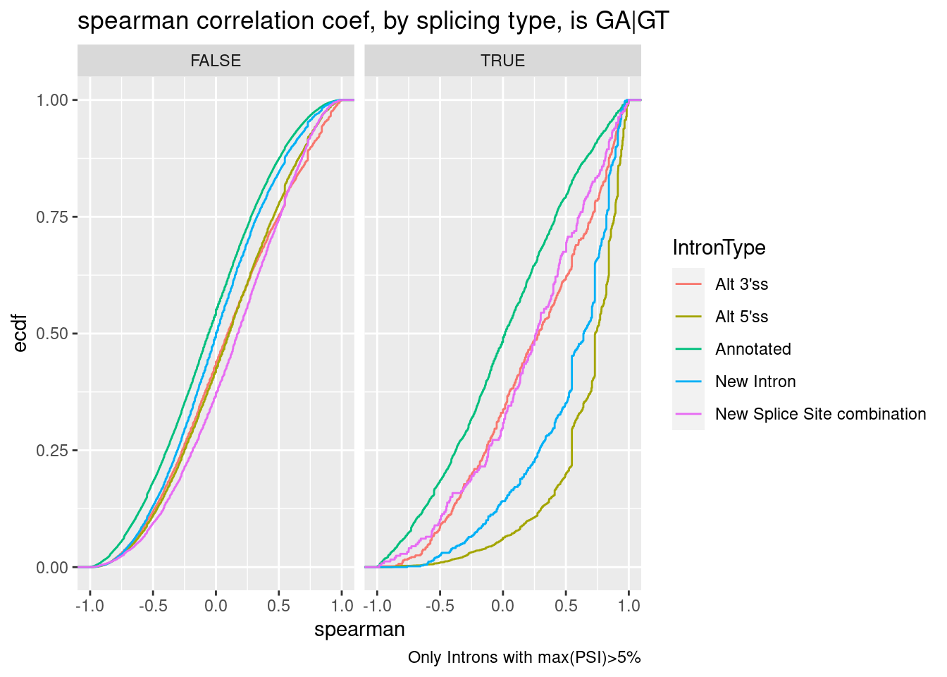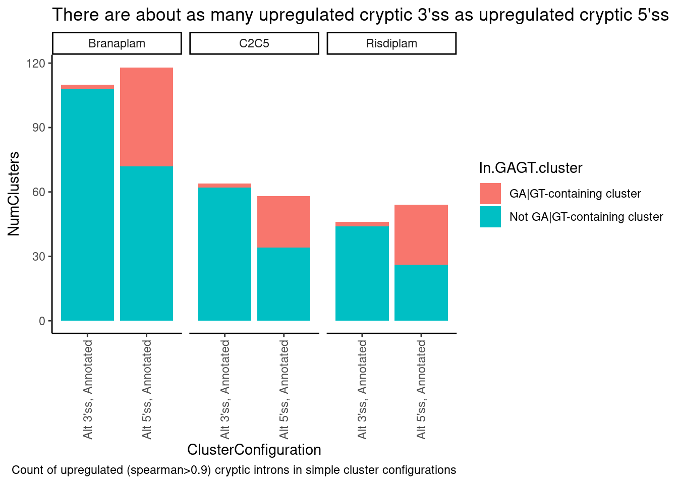 In my previous analysis based on fibroblast data, I found about as many instances of upregulated cryptic 3’ss splicing (restricted analyses to clusters with only 2 introns) as upregulated cryptic 5’ss. That suggested to me that the known mechanisms of increasing splicing at GA|GT introns only accounts for part of the observed splicing changes… For example, I hypothesized that these molecules may also promote activation of cryptic 3’ss through stabilizing non-canonical branchpoints with extra bulges to U2snRNA. However, I failed to detect any particular motif in the bpt region among the top cryptic 3’ss with MEME. Furthermore, in a more recent analysis, when I looked at the dose response data of a random set of ~200 introns, most introns did not have a reasonable looking dose-response effect, and in fact, the introns that did have a reasonable dose-response increase where mostly in GA-GT intron-containing clusters, suggesting the GA-GT introns do account for most of the direct dose-dependent effects of the molecules. Today I will investigate these ideas a bit more… For example, I want to get a better sense of what fraction of reliable dose-dependent effects can be attributed to GA-GT introns (or introns in the same cluster which can be attributed an effect on the GA-GT introns).