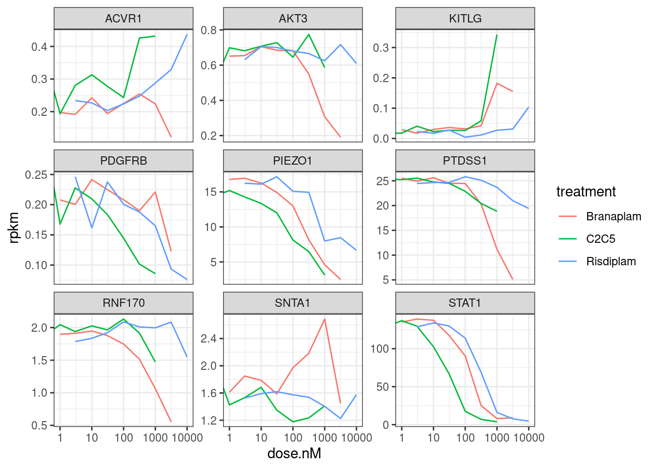 - The most intriguing part of the dose-response (DR) study is the selectivity difference between risdiplam and branaplam. Due to the similarity between risdiplam and C2-C5-1, we can even leave C2-C5-1 out for simplicity. We need a list of more genes that are (a) risdiplam selective and (b) branaplam selective, with complete coordinates. The criteria I can think of are as follows: