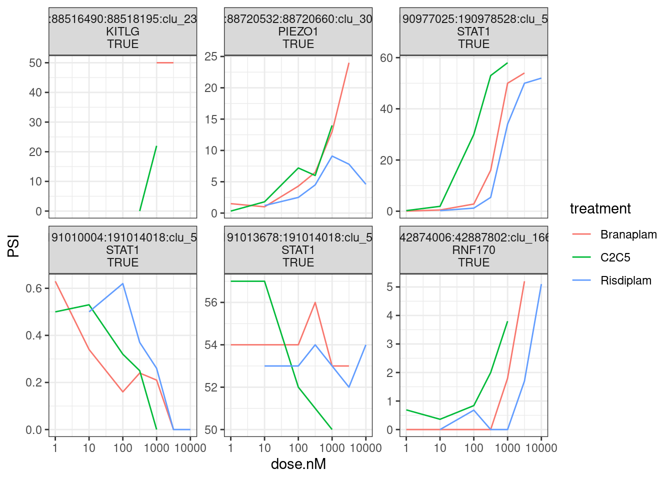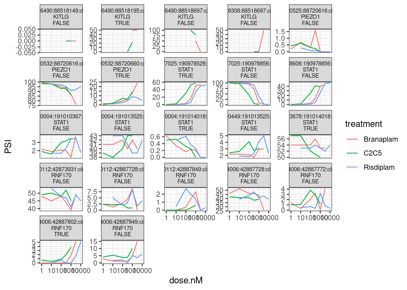 Perhaps the KITLG splice junction is not expressed enough to make an interpretable dose-response curves. But for RNF170, STAT1, and PIEZO1 at least there is one GA|GT junction that does indeed go up in dose-dependent manner…