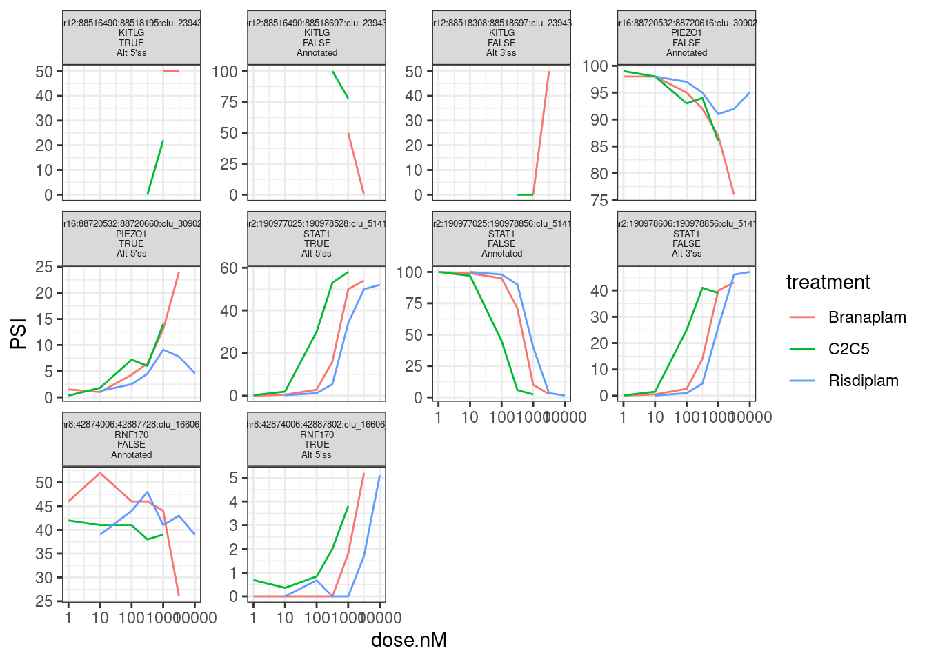 Out of these 150 or so dose-response curves, the most reliable looking ones are the ones in STAT1 and RNF170 which are involved in a GA|GT-containing splice cluster. So not so much evidence (at least from this limited sample) for direct effects at non GA|GT introns.
