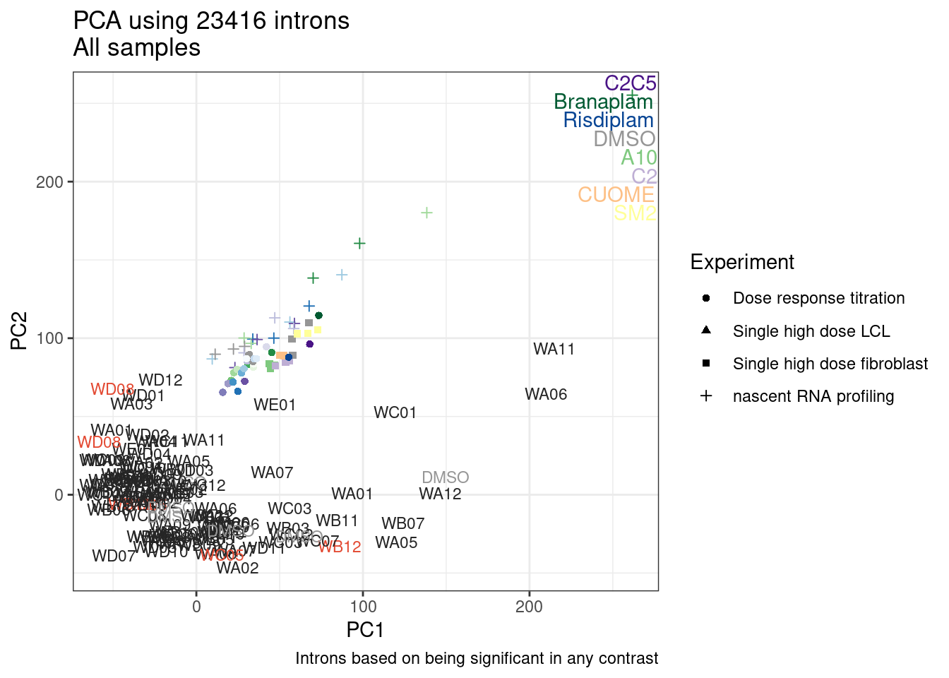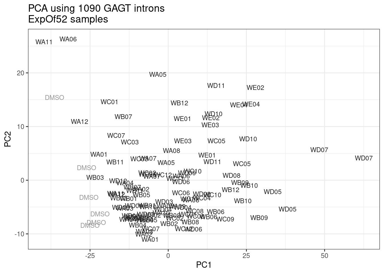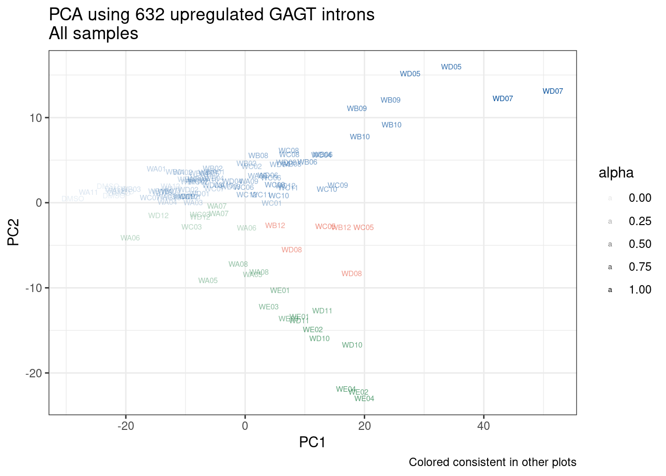 labs(title = "PCA using 632 upregulated GAGT introns\nAll samples", caption="Colored consistent in other plots")
