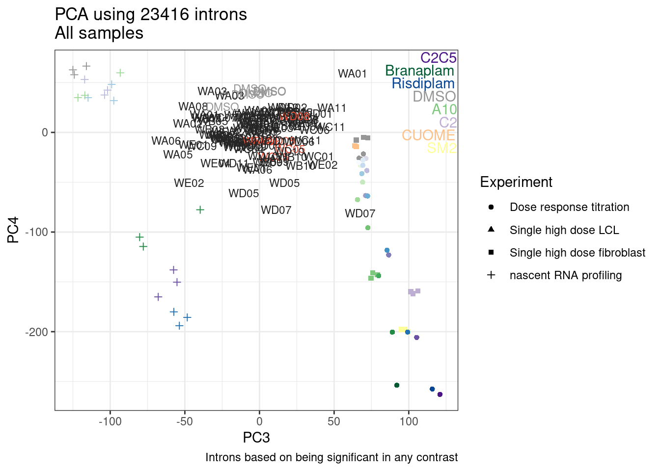 Ok, so I recovered the same CRYL1 intron, and also the FHOD3 intron. Still couldn’t find the intron for the other two genes… I think I am satisfied enough just to say these two introns might be good to validate molecule-specific effects, and also probably any number of the risdiplam-specific or branaplam-specific introns that I previously shared from the dose-response data.