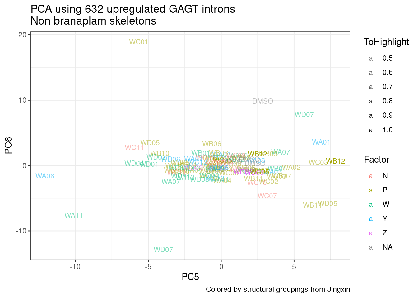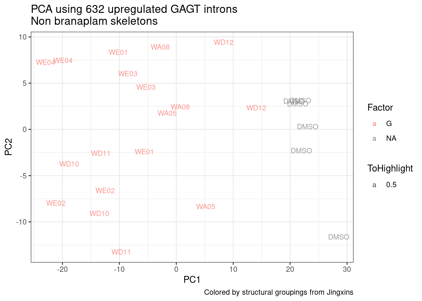 labs(title = "PCA using 632 upregulated GAGT introns\nNon branaplam skeletons", caption="Colored by structural groupings from Jingxin")