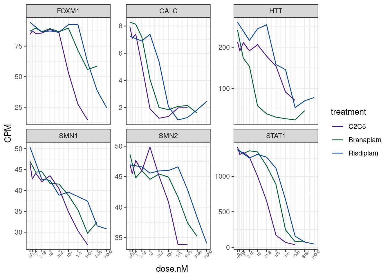 I previously fit dose response curves (log-logistic curve) to estimate EC50 in ridisplam, branaplam, and C2C5 for a few hundred GA|GT introns. Here I will explore the results, including looking for different 5’ splice patterns that explain the differences.