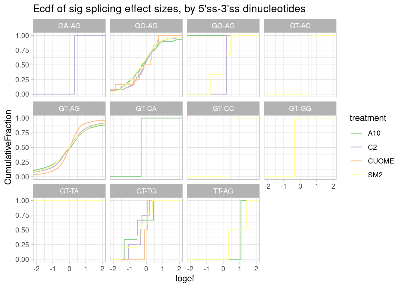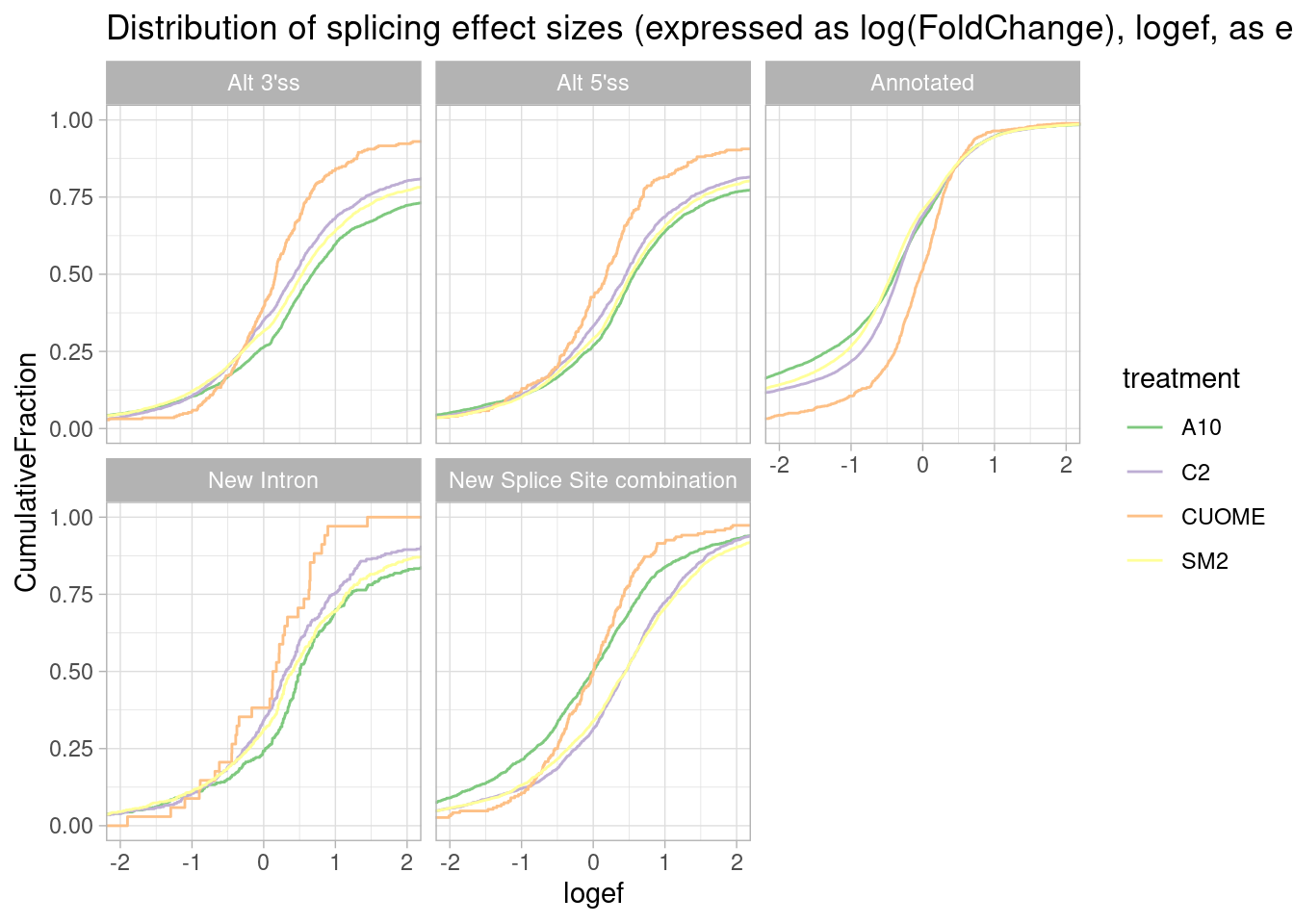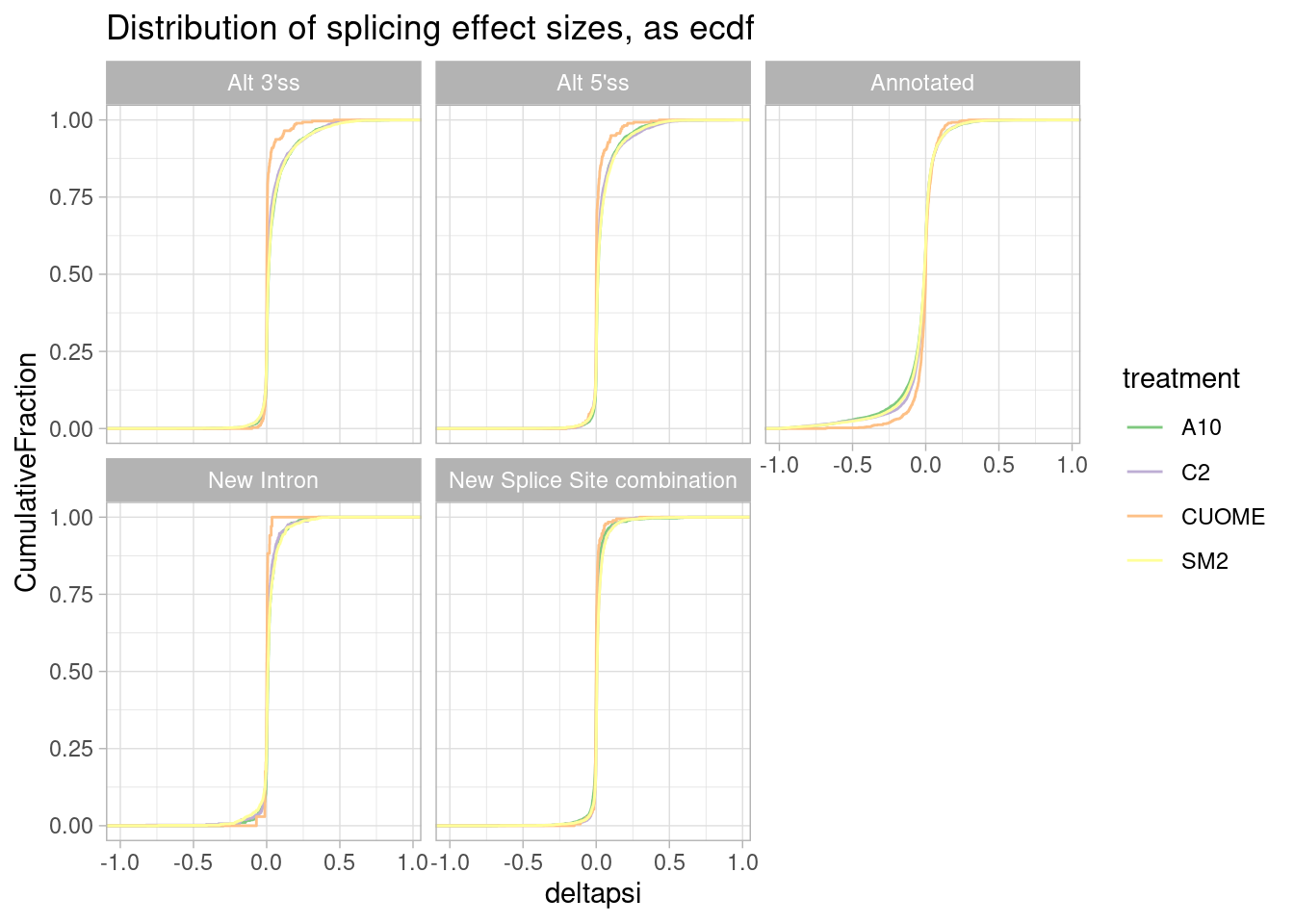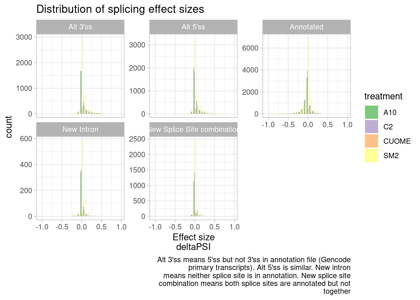Our collaborator, Jingxin, is interested in how small molecular drugs might effect splicing as eventually be used as treatments, like risdiplasm to treat SMA. Although antisense oligos have also been used to treat causal splicing defects in some SMA forms, small molecules may have general advatage over antisense oligos in in terms of efficient delivery to the necessary tissues. His lab has treated cells with 4 small molecules (SM2, CUOME, A10, and C2) and a DMSO control, 3 replicates for each treatment and DMSO. The goal with this experiment is to explore the splicing effects of these small molecular drugs, trying to better understand their molecular effects. Splicing was measured by RNA-seq which I have aligned with STAR and measured splicing and differential splicing with leafcutter. I also performed differential expression testing, by counting reads, fitting expression models and testing for differences with DMSO using edgeR.