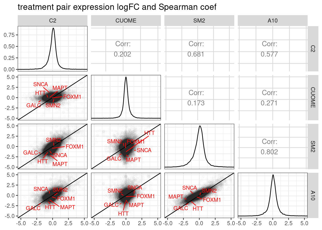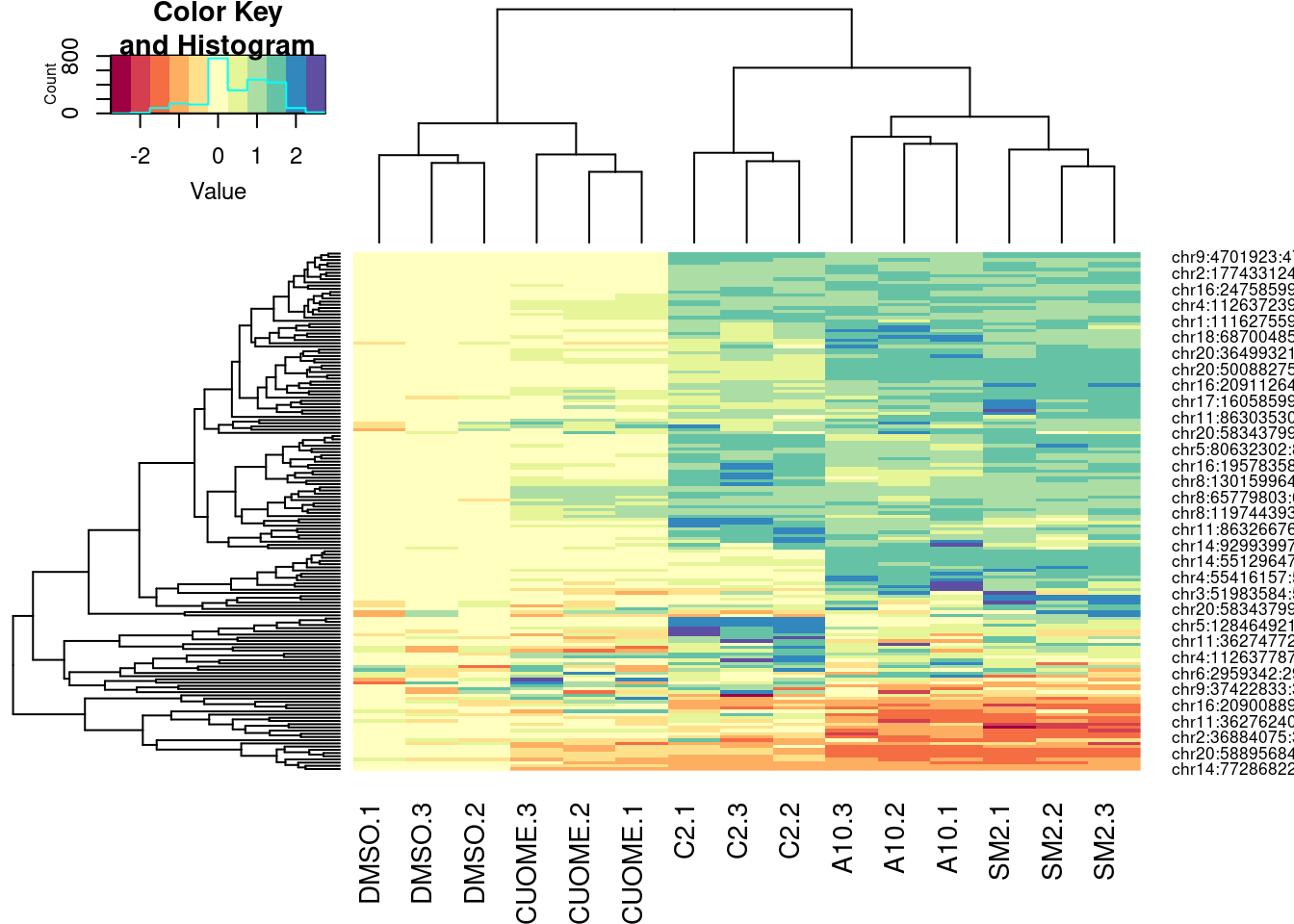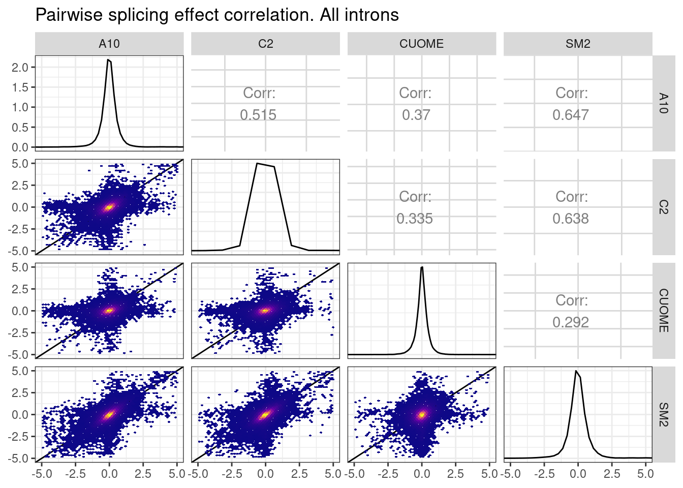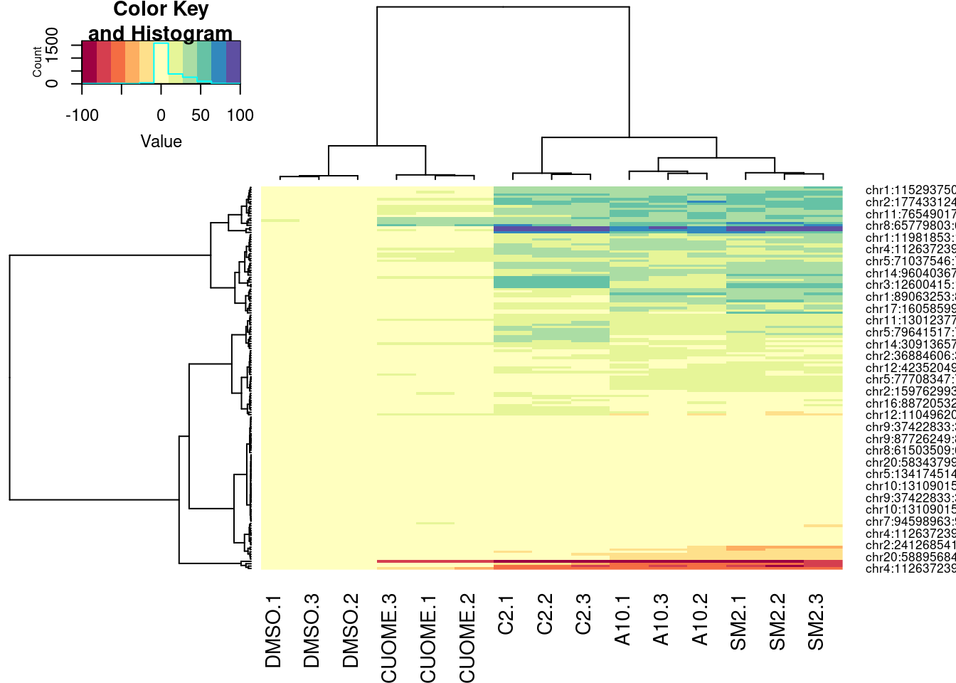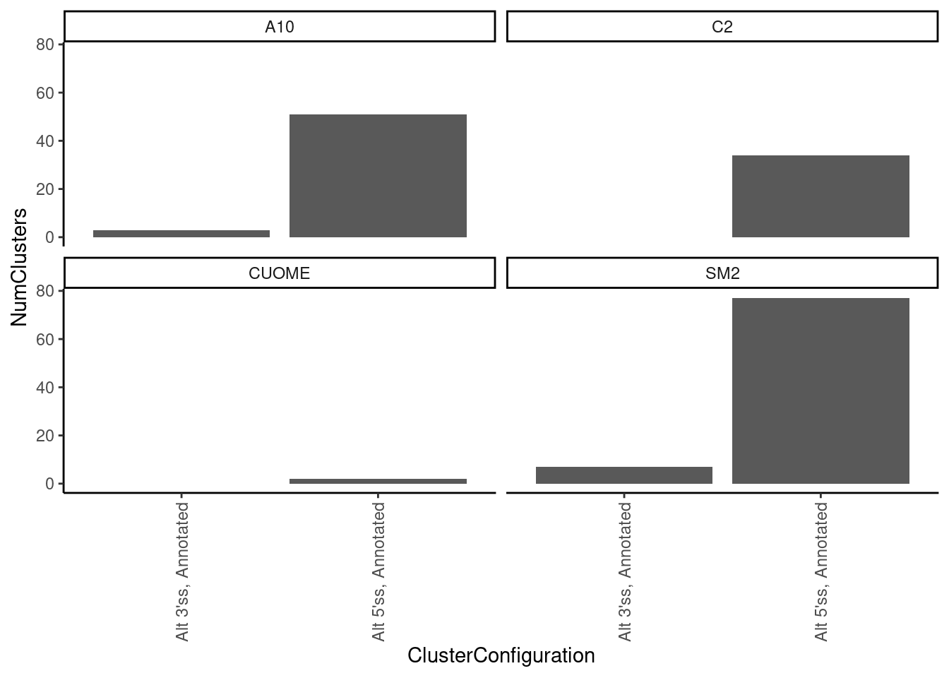 Our collaborator, Jingxin, is interested in how small molecular drugs might effect splicing as eventually be used as treatments, like risdiplasm to treat SMA. Although antisense oligos have also been used to treat causal splicing defects in some SMA forms, small molecules may have general advatage over antisense oligos in in terms of efficient delivery to the necessary tissues. His lab has treated cells with 4 small molecules (SM2, CUOME, A10, and C2) and a DMSO control, 3 replicates for each treatment and DMSO. The goal with this experiment is to explore the splicing effects of these small molecular drugs, trying to better understand their molecular effects. Splicing was measured by RNA-seq which I have aligned with STAR and measured splicing and differential splicing with leafcutter. I also performed differential expression testing, by counting reads, fitting expression models and testing for differences with DMSO using edgeR.