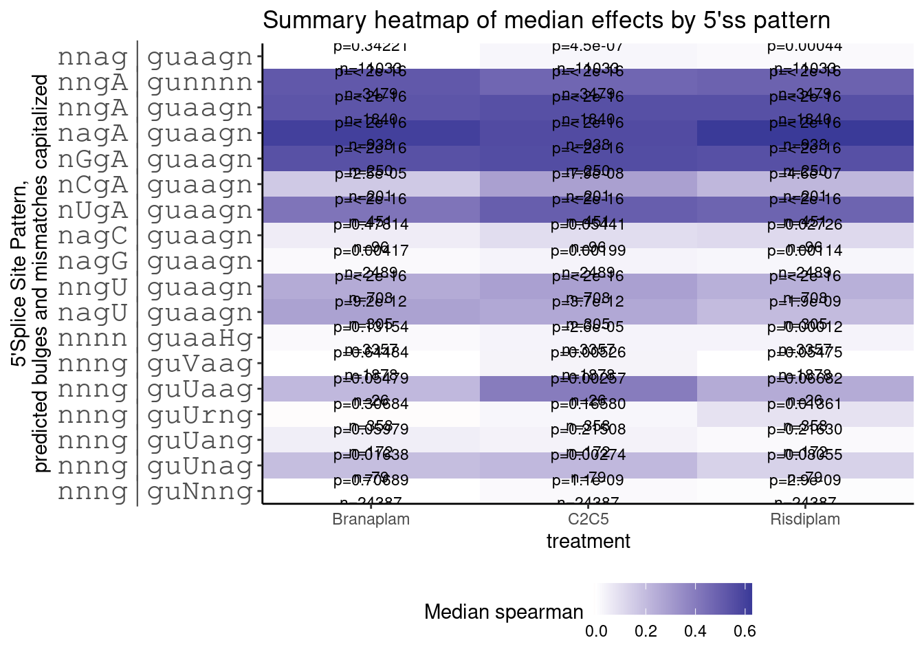 ggtitle("Summary heatmap of median effects by 5'ss pattern")