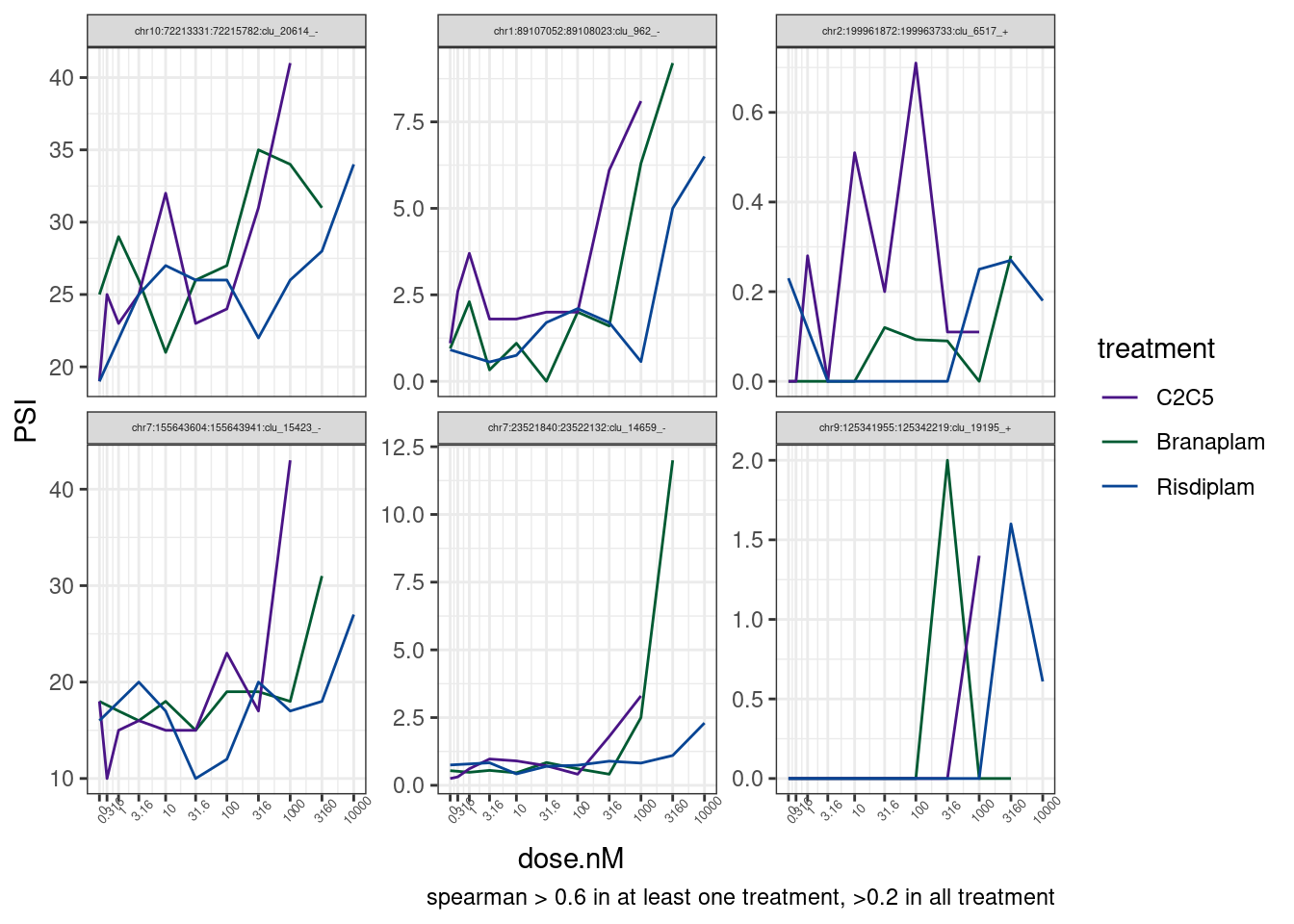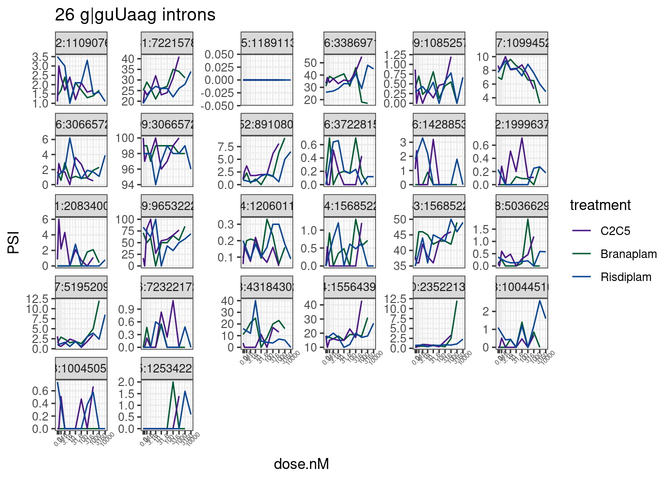 Not let’s plot dose response effect for all junctions with g|guUaag 5’ splice site.