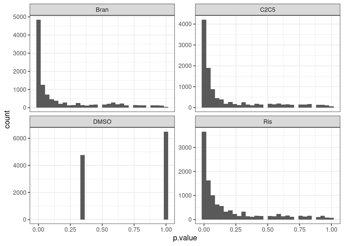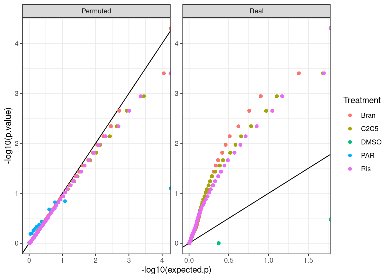 For the future I think I will want to first perform some sort of test like this to filter for genes for which to attempt fitting logistic curves, then compare the EC50 between treatments.