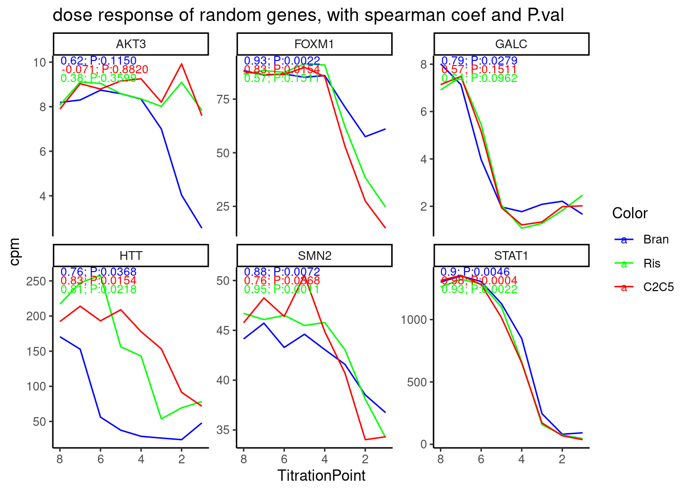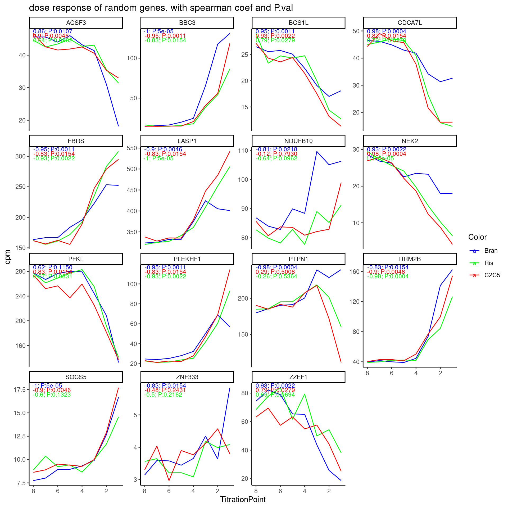 labs(title = "dose response of random genes, with spearman coef and P.val") +