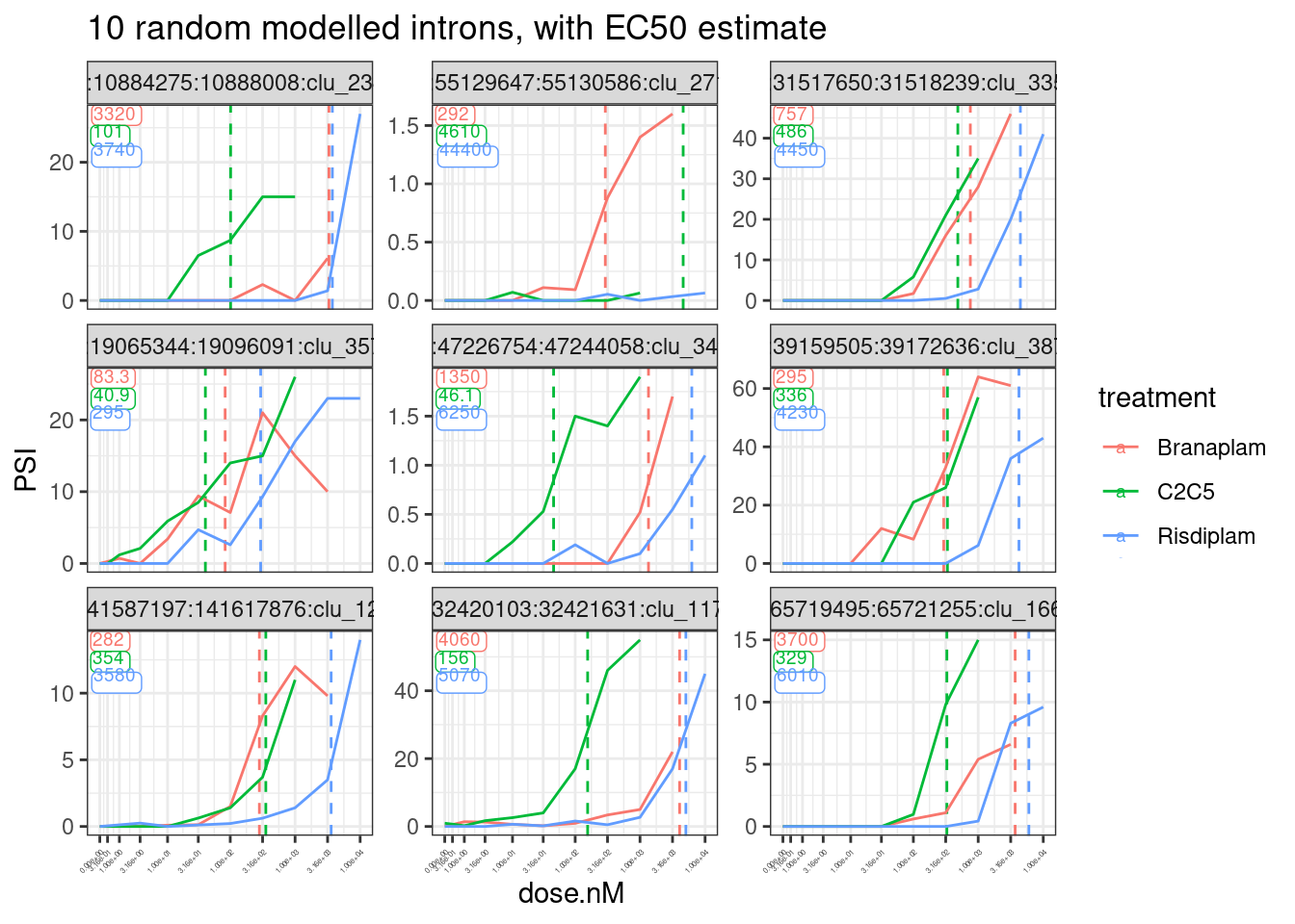 So in here I will do that data tidying, including modelling and estimating EC50 for all GA|GT introns. As in my previous notebook, I will fit a 4-parameter model jointly with all three treatments, fixing the same upper and lower limit parameters, as well as the same slope parameter, and only allowing the EC50 parameter to vary. This is a tutorial I found useful to understand details about fitting these models with drc package. I will use PSI as the response. In some sense, this may be unideal, and using the log-transformed junction excision ratio with a small pseudocount might be better for the future, to keep errors more normally distributed and reasonable heterskedasticity. But PSI is easily interpretable and also, from my experience fitting these models to gene expression with logCPM versus CPM, I think these various possibly transforms of the response variable won’t bias or make much difference to the EC50 parameter estimate - it’s really the standard error that is sensitive to these things. So for simplicity, interpretabiliy, and so I can quickly copy/paste some code, I will keep using PSI as the response variable.