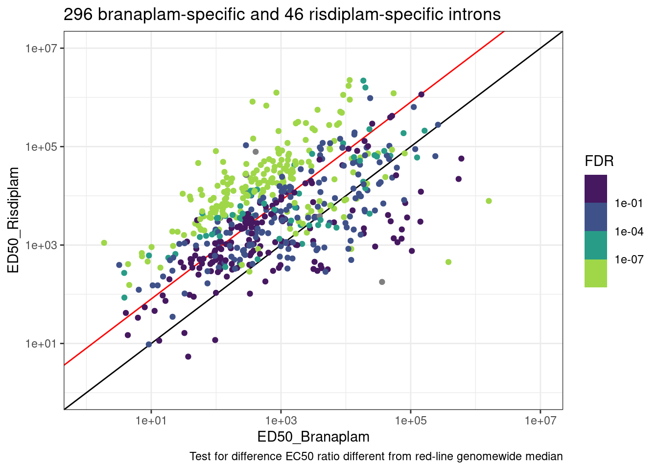 labs(title="296 branaplam-specific and 46 risdiplam-specific introns", color="FDR", caption="Test for difference EC50 ratio different from red-line genomewide median")