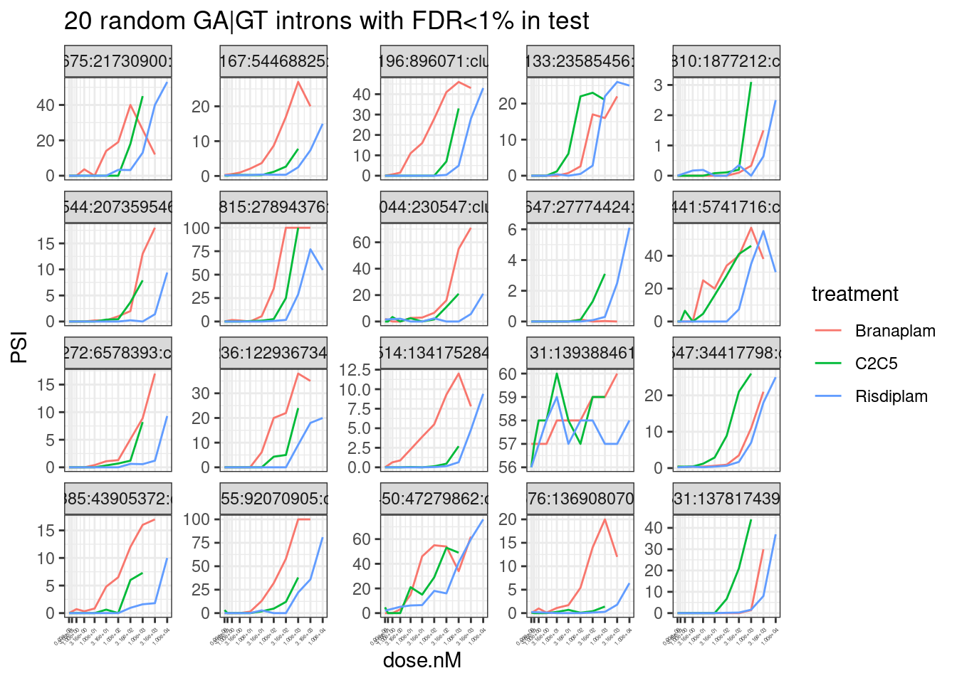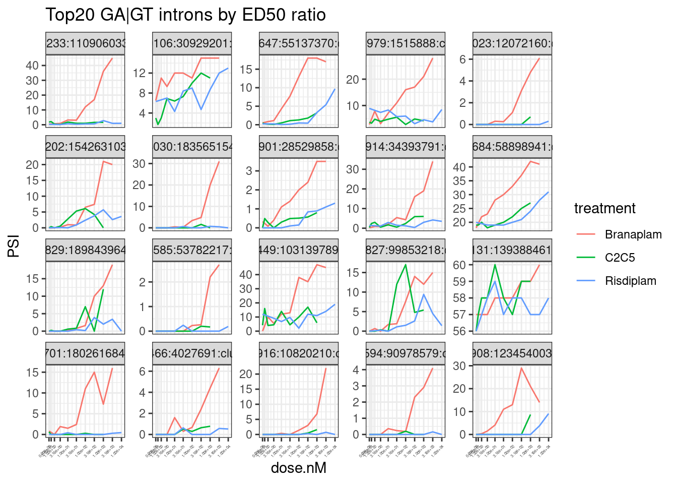 Next let’s plot dose response curves for the top20 juncs by branaplam vs risdiplam EC50 ratio point estimate. Before seeing these plots, I’m not sure whether I should expect to be outliers with really questionable dose response curves, or whether they are really believable results.