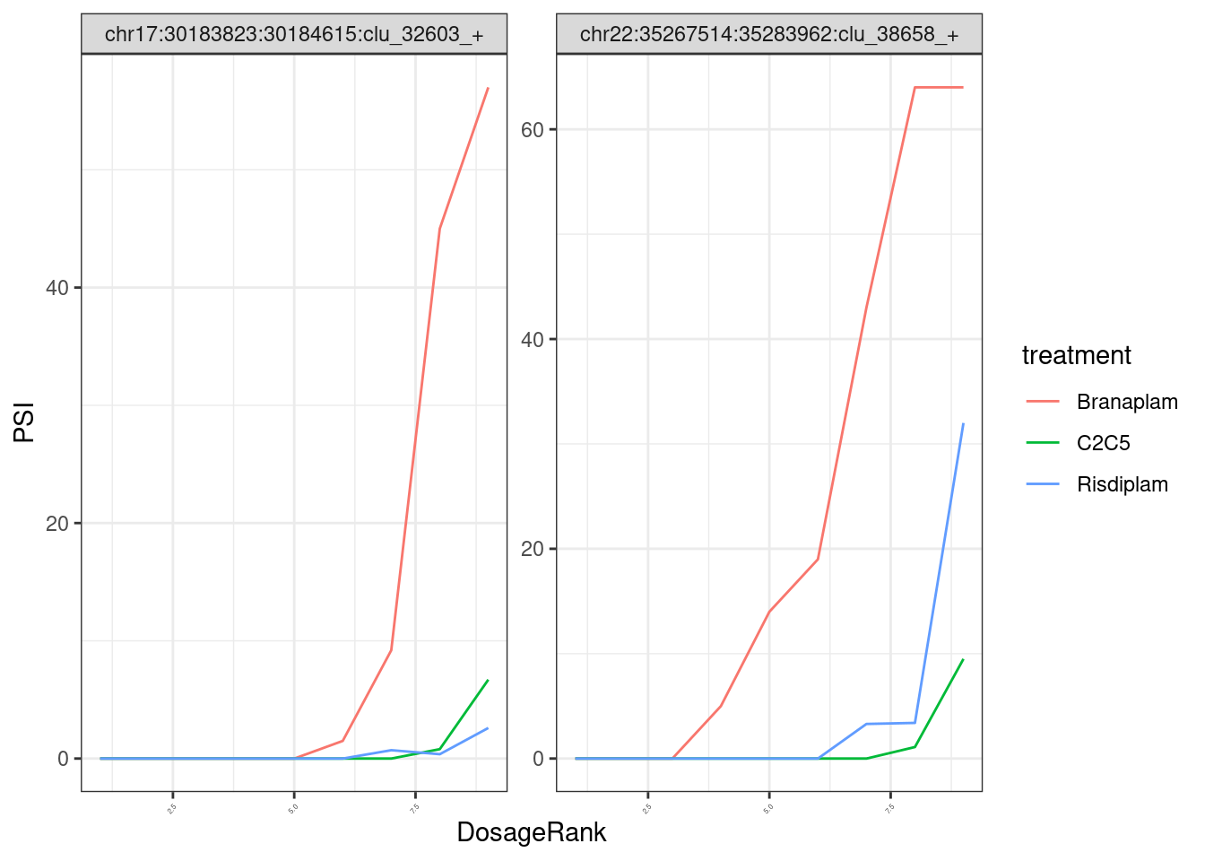 Hi Jingxin, Yeah, I also was assuming that you were looking for some disease-relevant splice junctions and also branaplam-specific or risdiplam-specific splice junctions for purposes of validation in minigenes. But yes I agree that in order to maximize power to discover the mechanisms of specificity, it will be advantageous to include as many splice sites as possible in our analyses. There are certainly more risdiplam-specific or branaplam specific splice junctions than the 21 I shared with you. So I can share a bigger list with you. I don’t think it would take up too much of my time, and I wouldn’t want to be a limiting factor if you all are anxious to explore the data. So here is what I propose I do - I think this is a reasonable compromise between my time and giving you more from this data, from which you can further explore your own ideas: I will fit a model to estimate EC50 for all GA|GT splice junctions that are reasonably present in the LCL data. The model-fitting process is something that I am still perfecting, so I think the EC50 estimates I can share with you quickly (ie today or tomorrow) might be slightly different than the final EC50 estimates that I would ideally want to use in a final analysis for publication - but for now, using the model-fitting process I used in my notebook link I shared, I think that the EC50 estimates are good enough to be useful for some downstream exploratory analyses. I’ll share you a table with raw splice junction counts for each sample and other metadata (eg 5’ss sequence, intron coordinates, AS intron type, etc) for each intron I’ll share a globus link so you can download bam files or bigwig files for easily browsing the raw aligned RNA-seq data in IGV genome browser. Globus is a service to make it easy to transfer large data files. I think you will need to make sure you (or Junxing or whoever wants to download the data) has an account that you can log into first (https://crc.ku.edu/hpc/storage/globus), then I can share a link to your account email for you to download these large files. I have been looking at this raw coverage data for each of the 21 splice events I shared with you, but I was only that careful because I thought you were cloning these things which I know can be a lot of work, and I wanted to be 100% sure the splicing event you were cloning was a simple/interpretable cassette exon. For downstream analyses to uncover mechanisms, it may not be necessary to be so careful, but nonetheless I figure browsing the raw coverage files can be very useful and worth sharing. How does that all sound.