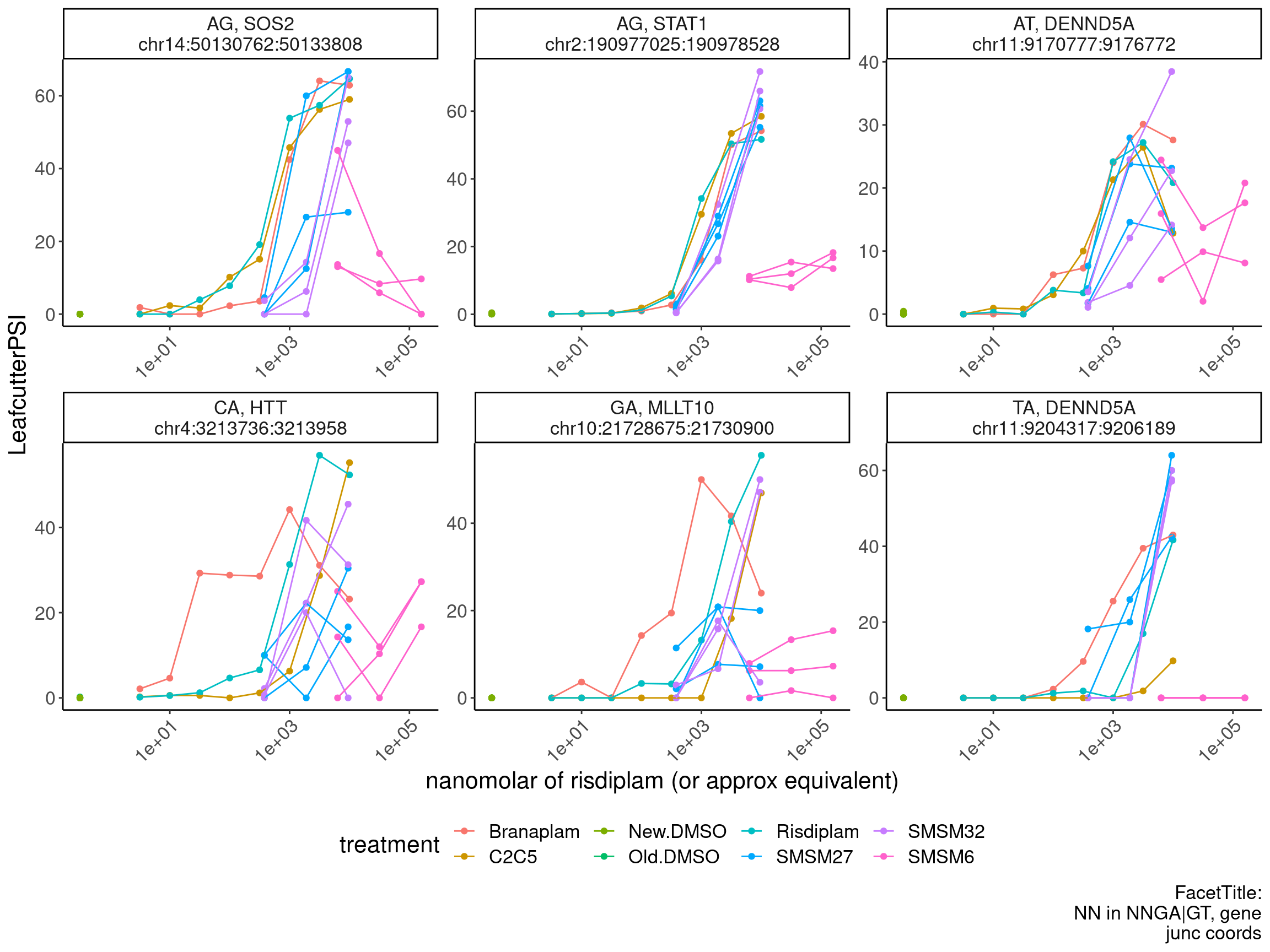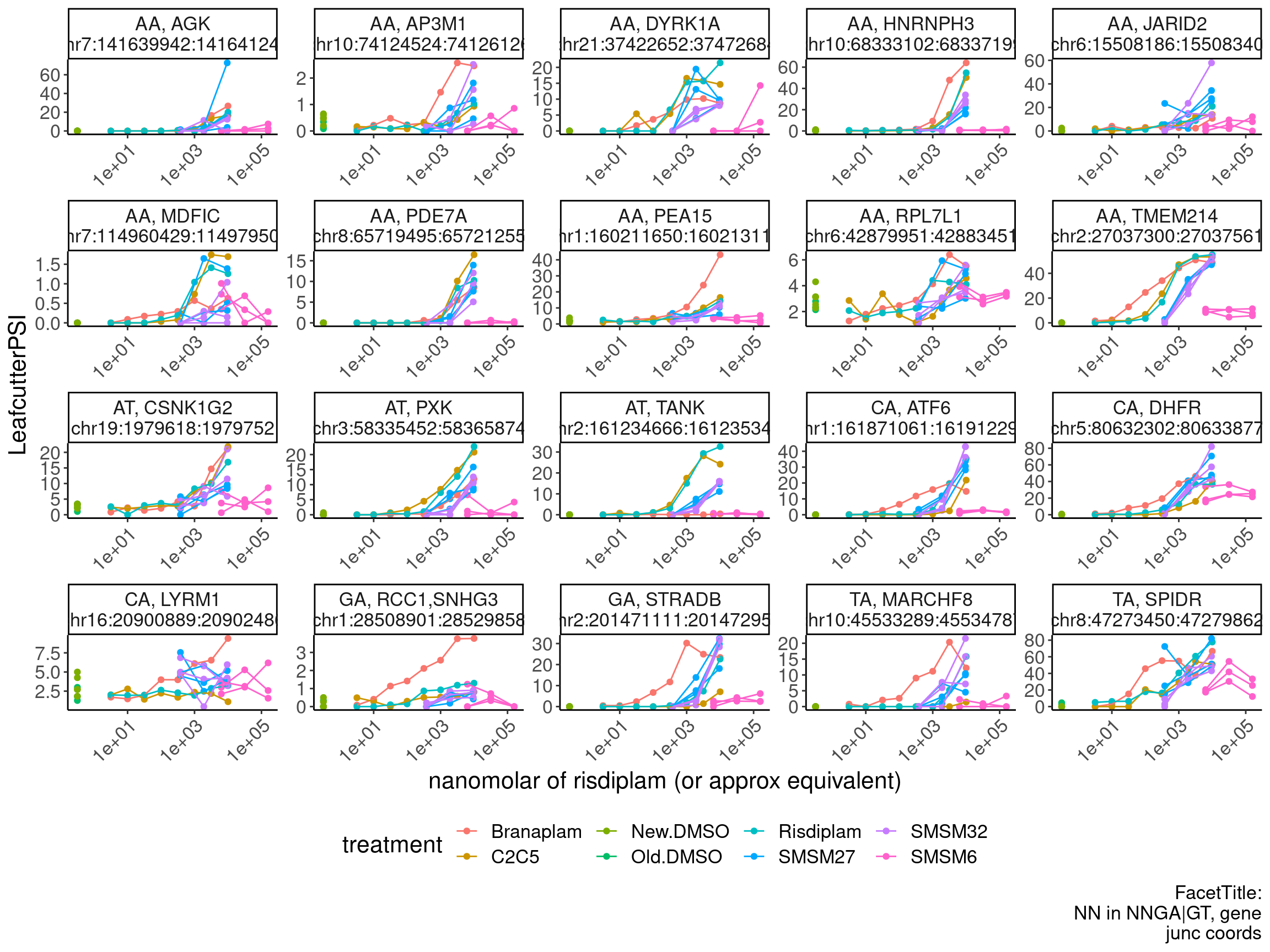 labs(x="nanomolar of risdiplam (or approx equivalent)", caption="FacetTitle:\nNN in NNGA|GT, gene\njunc coords") +